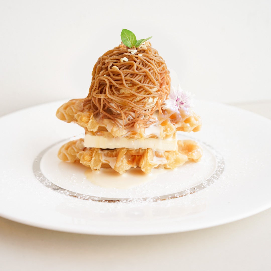 リッチクロッフル-モンブランチーズケーキ-(写真右) | モンブランでコーティングされたアイスがクロッフルの熱で溶け出し濃厚なソースに早替わり。老若男女に大人気のモンブランを焼きたてのクロッフルと共にご堪能ください。 | ¥1,480 |