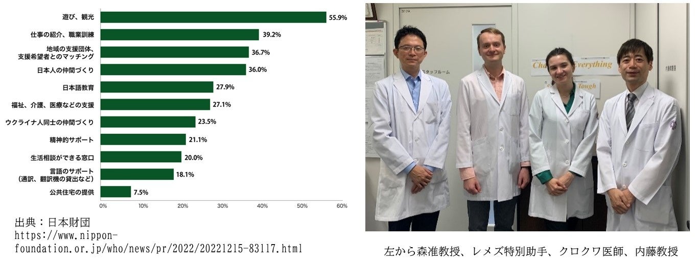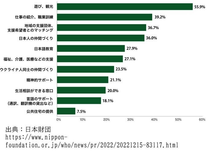 法務省の発表によると(2023年3月1日時点)、日本に在留しているウクライナ避難民の数は2,191名で、徐々に増加しています。また、日本財団が当該財団の支援を受けている来日ウクライナ避難民750名を対象に行ったアンケート調査(2022年11月28日~12月12日)によると、4人に1人となる24.7%の避難民が「できるだけ長く日本に滞在したい」と、定住の意向を持っていることが明らかになり、「ウクライナの状況が落ち着くまでは、しばらく日本に滞在したい」と回答した人と合わせると65.5%の避難民が長期での日本滞在を希望していることが分かりました。また、同アンケートにより、約3割の方が医療の支援を必要としていることがわかりました。