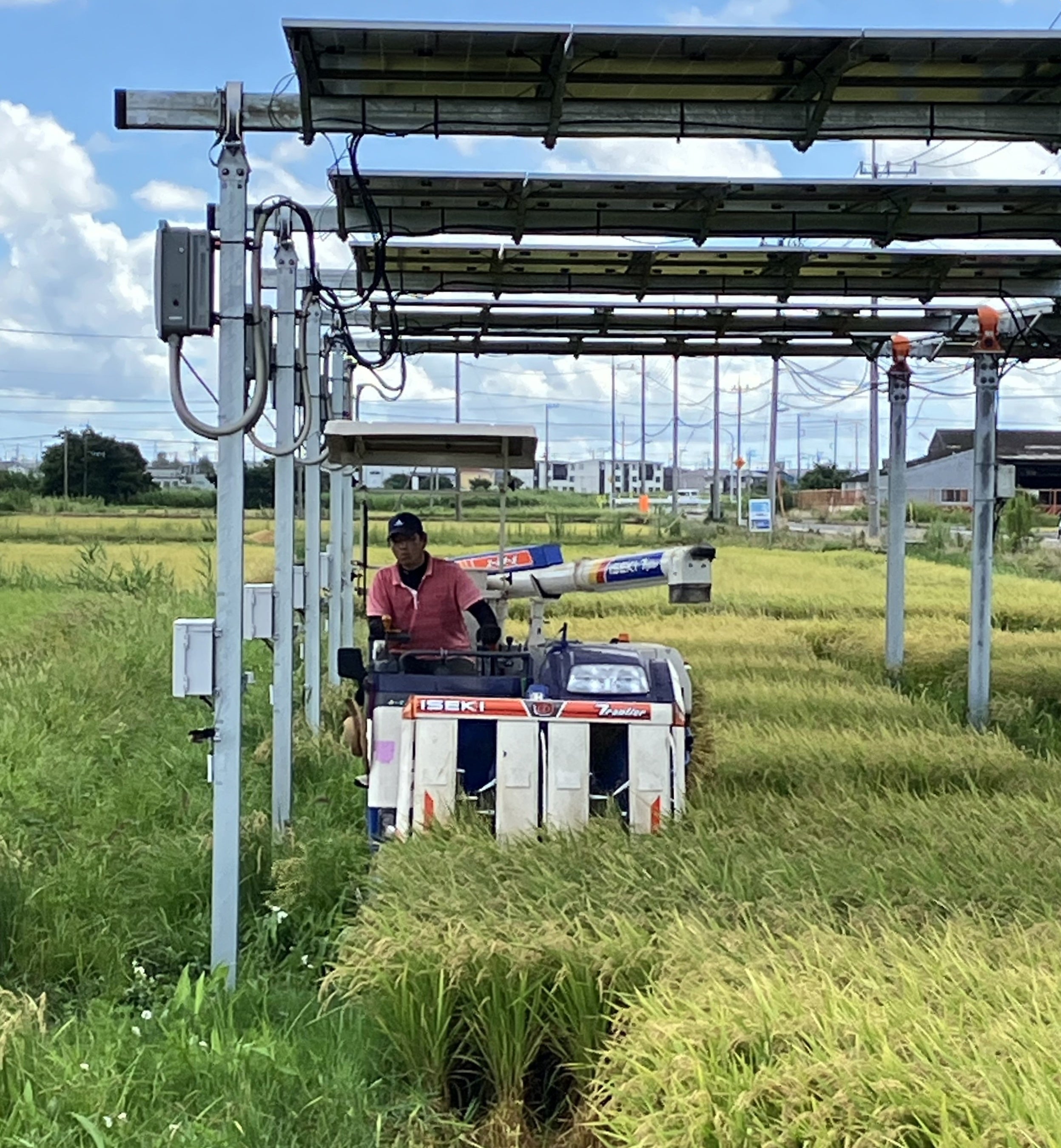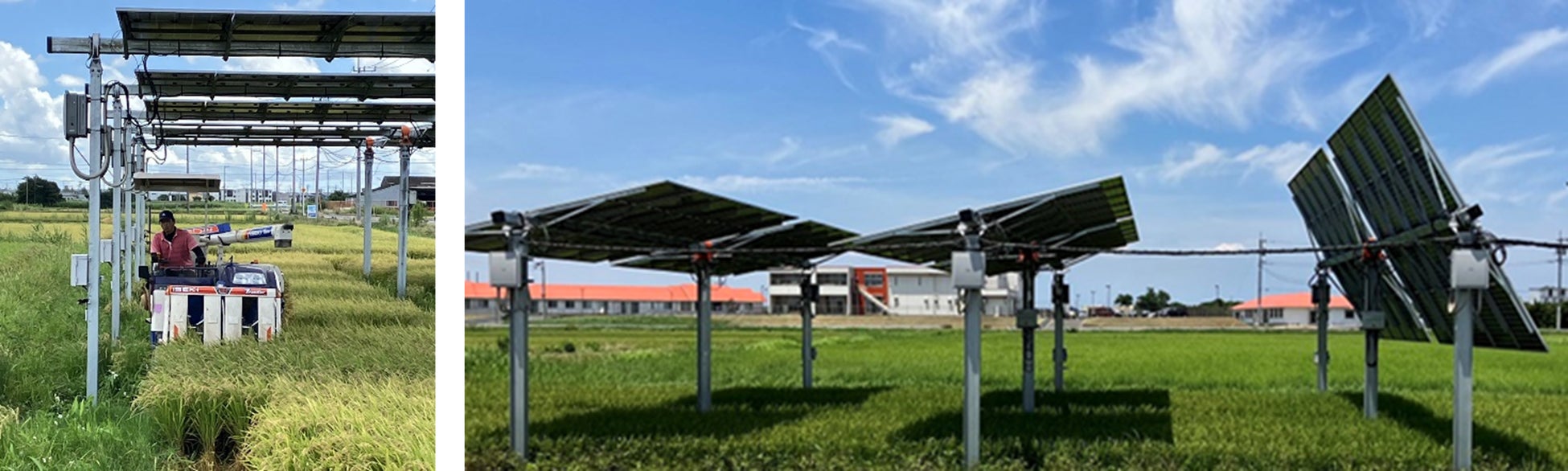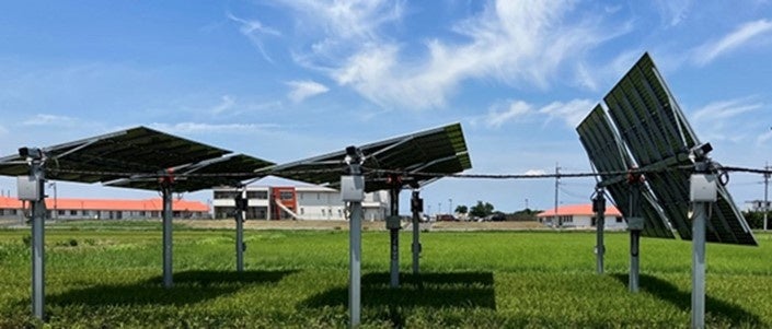 当社は、本システムを用いて、2023年6月から千葉県木更津市の水田に初号機となる小規模プラント(45kW)を建設して実証を行っています。収穫した米の収量・品質等の農業面やトラッカーによるパネル制御等の技術面に問題がないこと、トラッカーと両面モジュールの採用により通年ベースで野立て発電設備と同等の発電量を確保できることを確認しました。2025年度には2号機となる大規模プラント(2MW)の建設を予定しています。