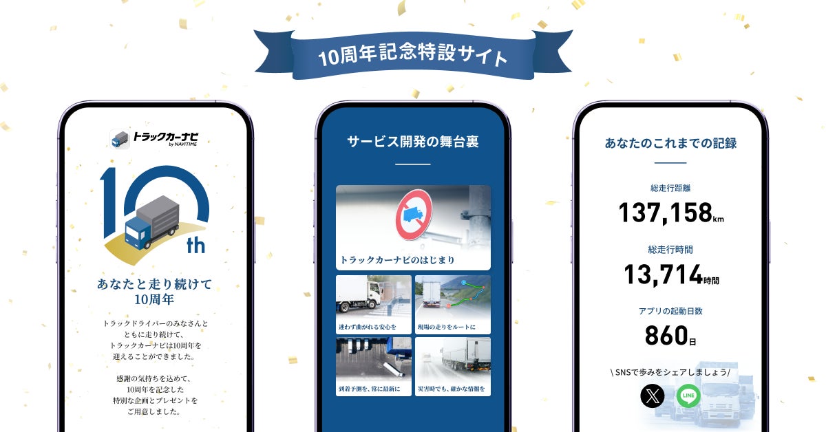 株式会社ナビタイムジャパン(代表取締役社長:大西 啓介、本社:東京都港区)のトラック専用カーナビアプリ『トラックカーナビ by NAVITIME』は、2026年3月28日(土)に、サービス提供開始から10周年を迎えます。日頃のご愛顧に感謝し、本日より10周年を記念した特設サイトの公開とプレゼントキャンペーンを実施いたします。