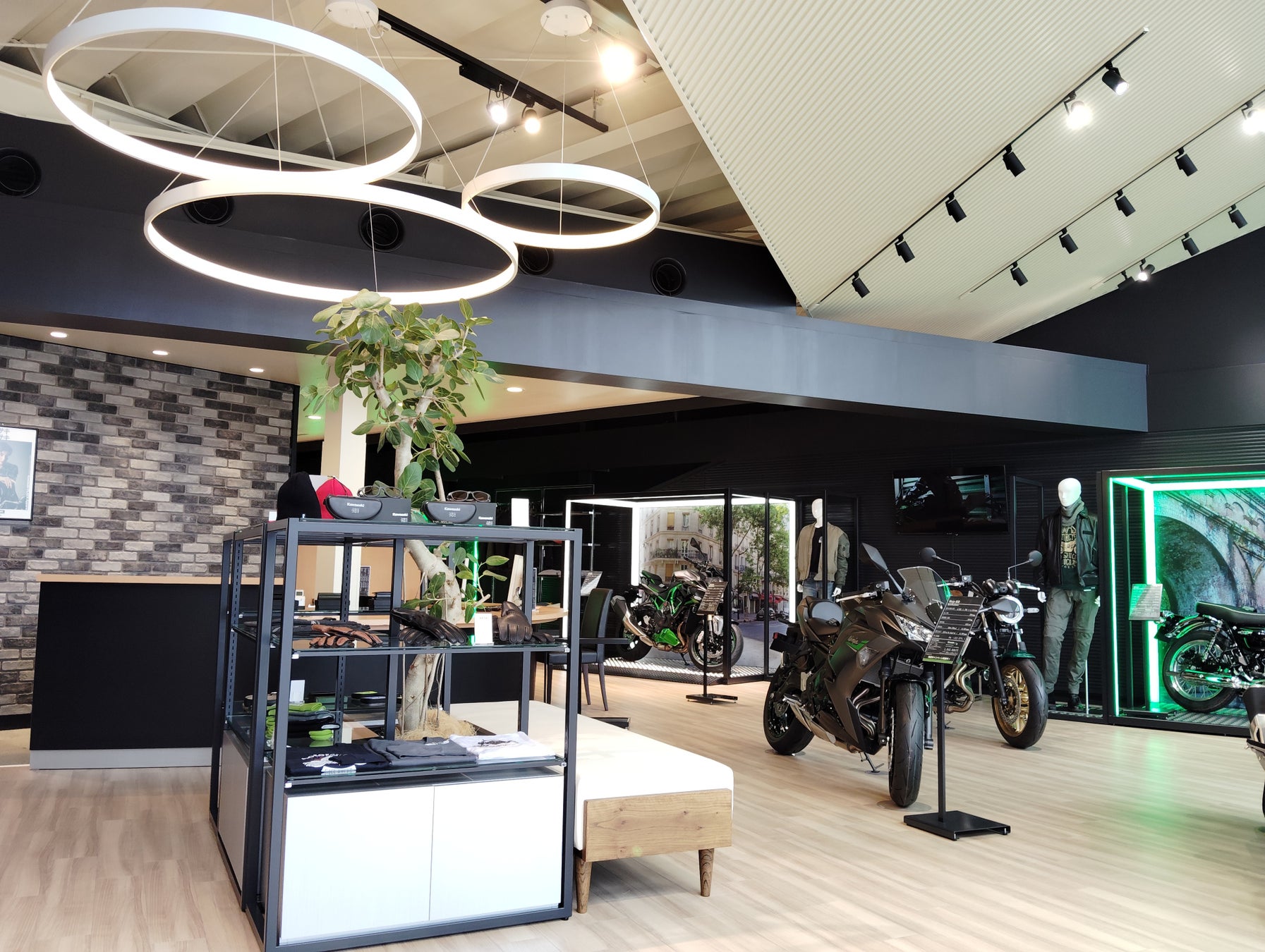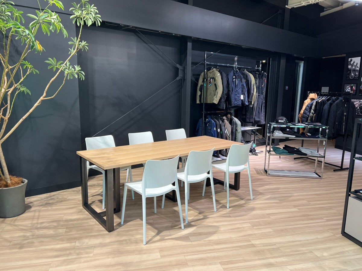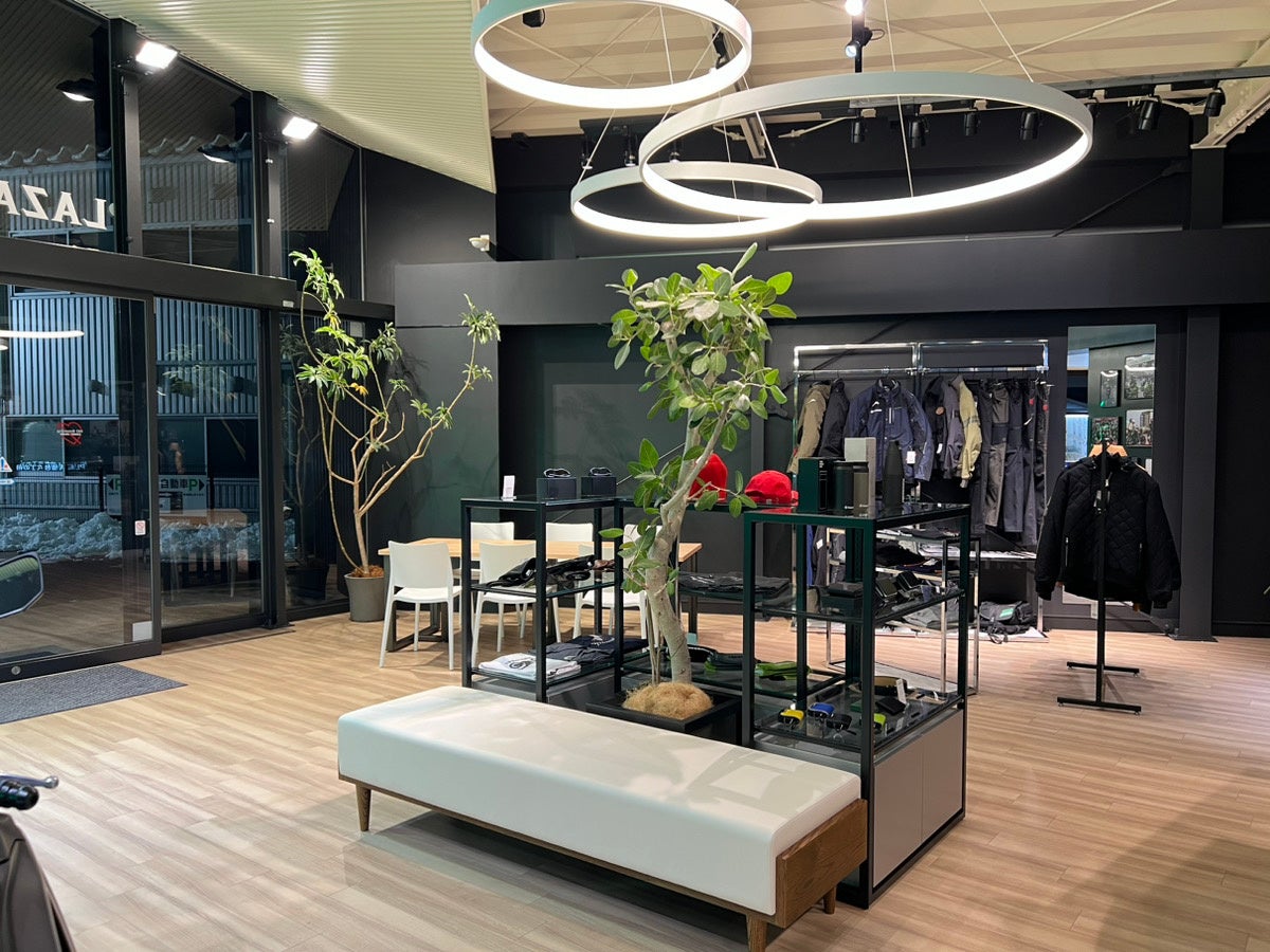 ウッディなフロアと白い天井で明るい店内。モーターサイクルとプラザアパレルがゆったりと展示され、どなたでも楽しめる空間としています。