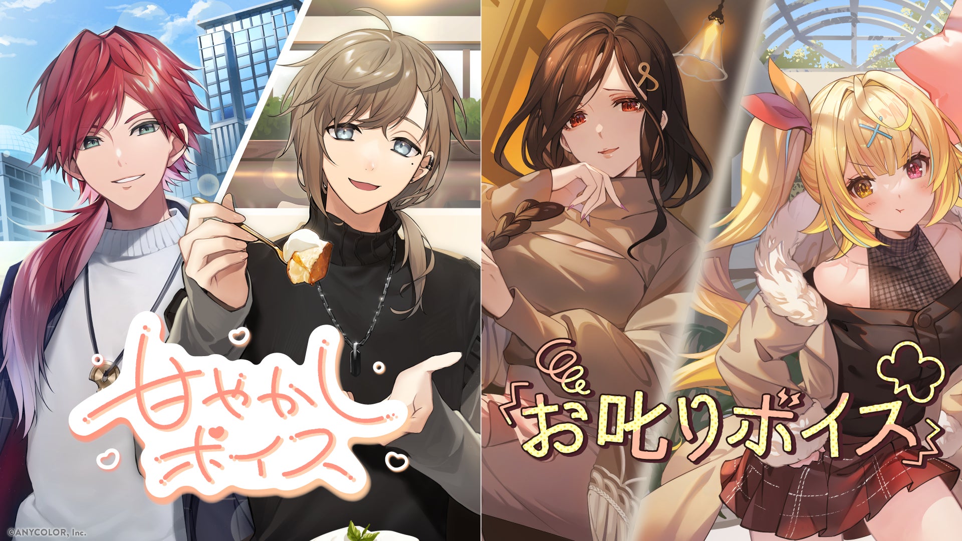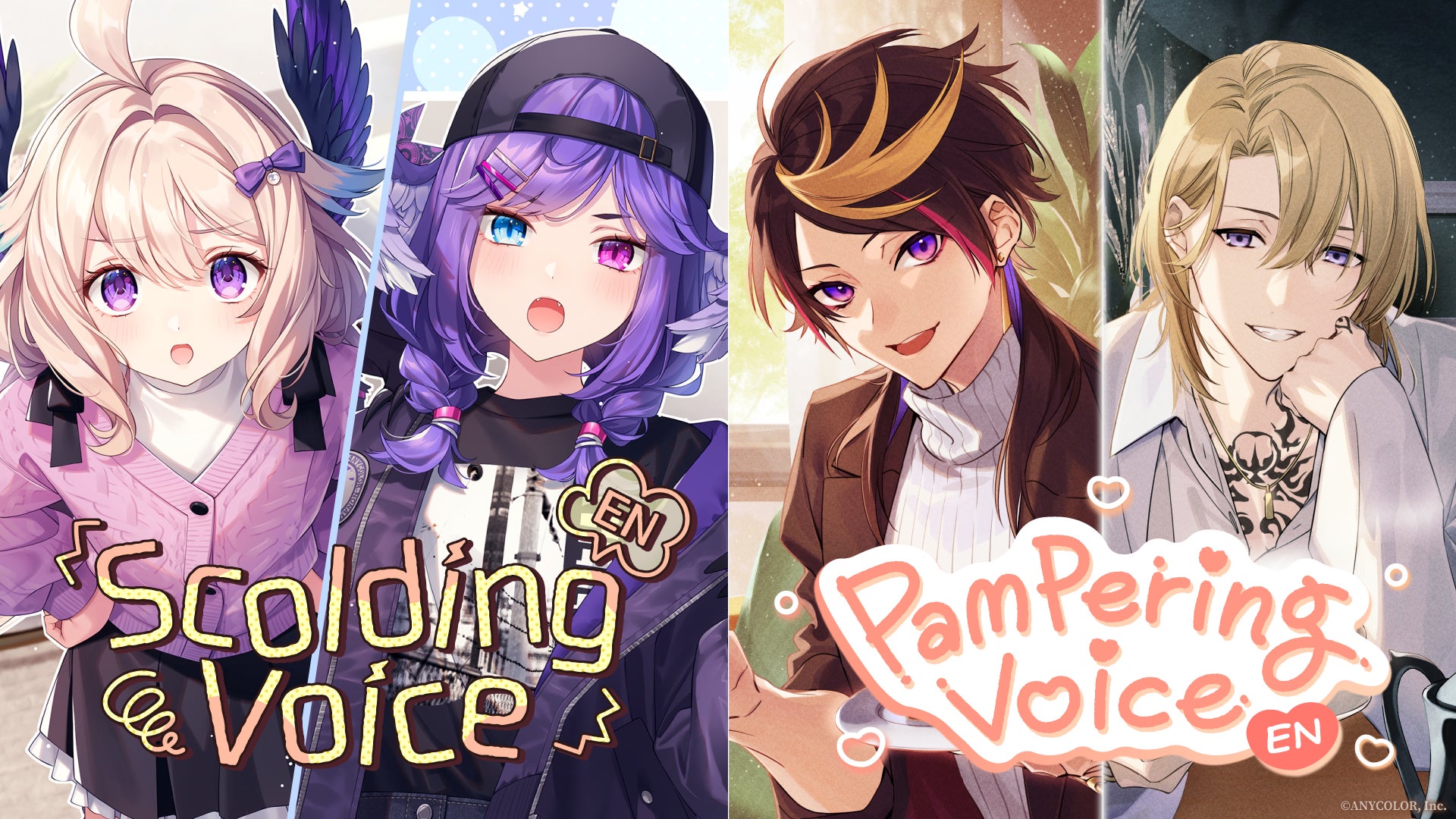 甘やかしボイスのキービジュアルは、叶&ローレン・イロアス、闇ノシュウ&ルカ・カネシロ!お叱りボイスのキービジュアルは、白雪巴&星川サラ、エナー・アールウェット&セレン 龍月!