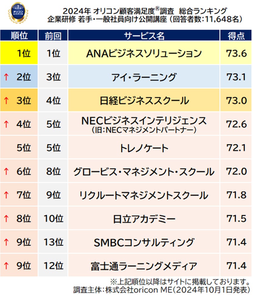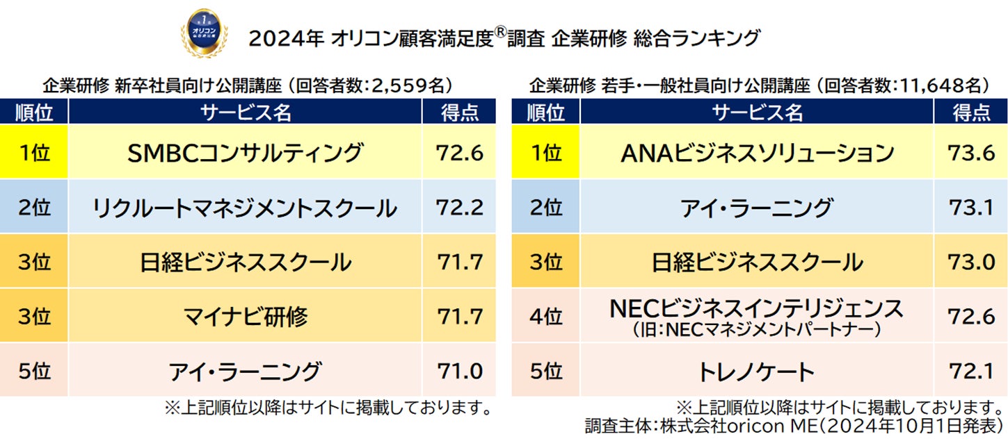 実際のサービス利用者を対象に、第三者の立場で顧客満足度調査を実施する株式会社oricon ME(本社:東京都港区 代表取締役社長:小池 恒 略称:オリコン)は、『企業研修(新卒社員向け公開講座/若手・一般社員向け公開講座)』の満足度調査を実施し、2024年10月1日(火)14時にその結果を「オリコン顧客満足度®」公式サイト内( https://life.oricon.co.jp/ )にて発表いたしました。ランキングの結果は、下記の通りとなりました。