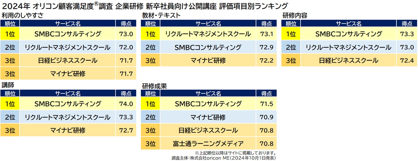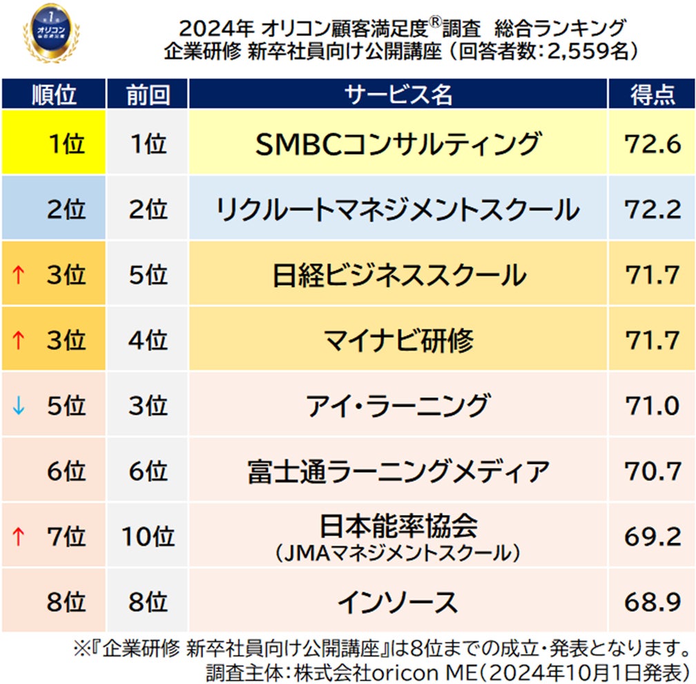 満足度の高い『企業研修』ランキング『企業研修 新卒社員向け公開講座』【SMBCコンサルティング】が3年連続の総合1位(オリコン顧客満足度®調査)