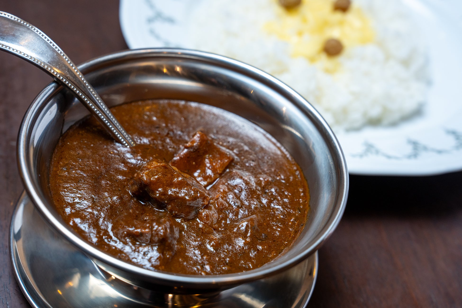 1982年に創業し、⻑く愛され続けるカレー&シチューの⼈気店。シェフの⻑年の経験から⽣まれた独⾃のスパイス使いが全国各地のファンを魅了する。ほんのり⽴ち上がるスパイスの⾹りに、ソースの深い褐⾊。「トマト」のカレーは、36種類のスパイスや⾹味野菜、フォンドヴォーなどを約140時間じっくり煮込んで丹念に仕上げるという、薬膳料理にも似た味わいが魅⼒。