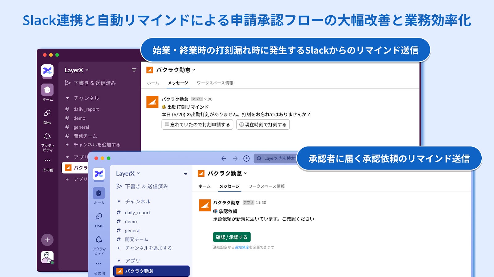 「バクラク勤怠」の導入により、Slack連携によって申請承認フローが大幅に改善しました。