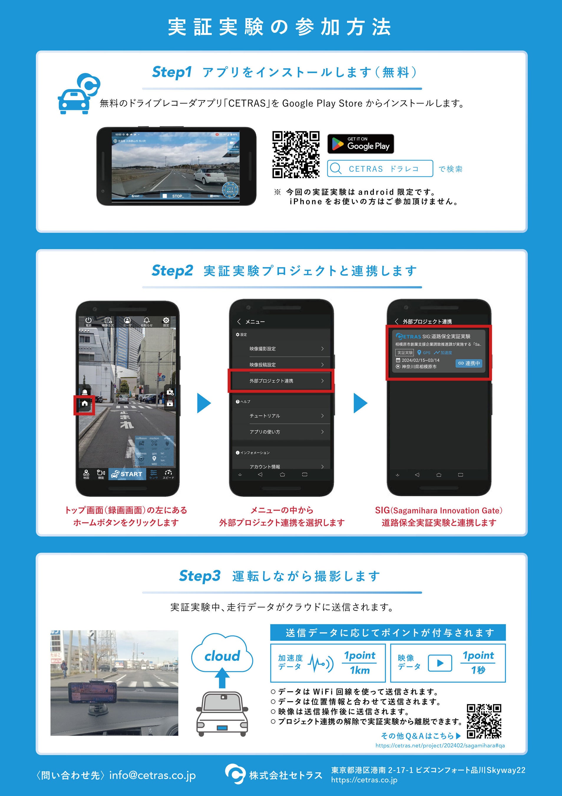 相模原市内を運転される方の車のドライブレコーダーに、ドラレコアプリ「CETRAS」(無料)をインストールいただき、データ取得に協力いただきます。