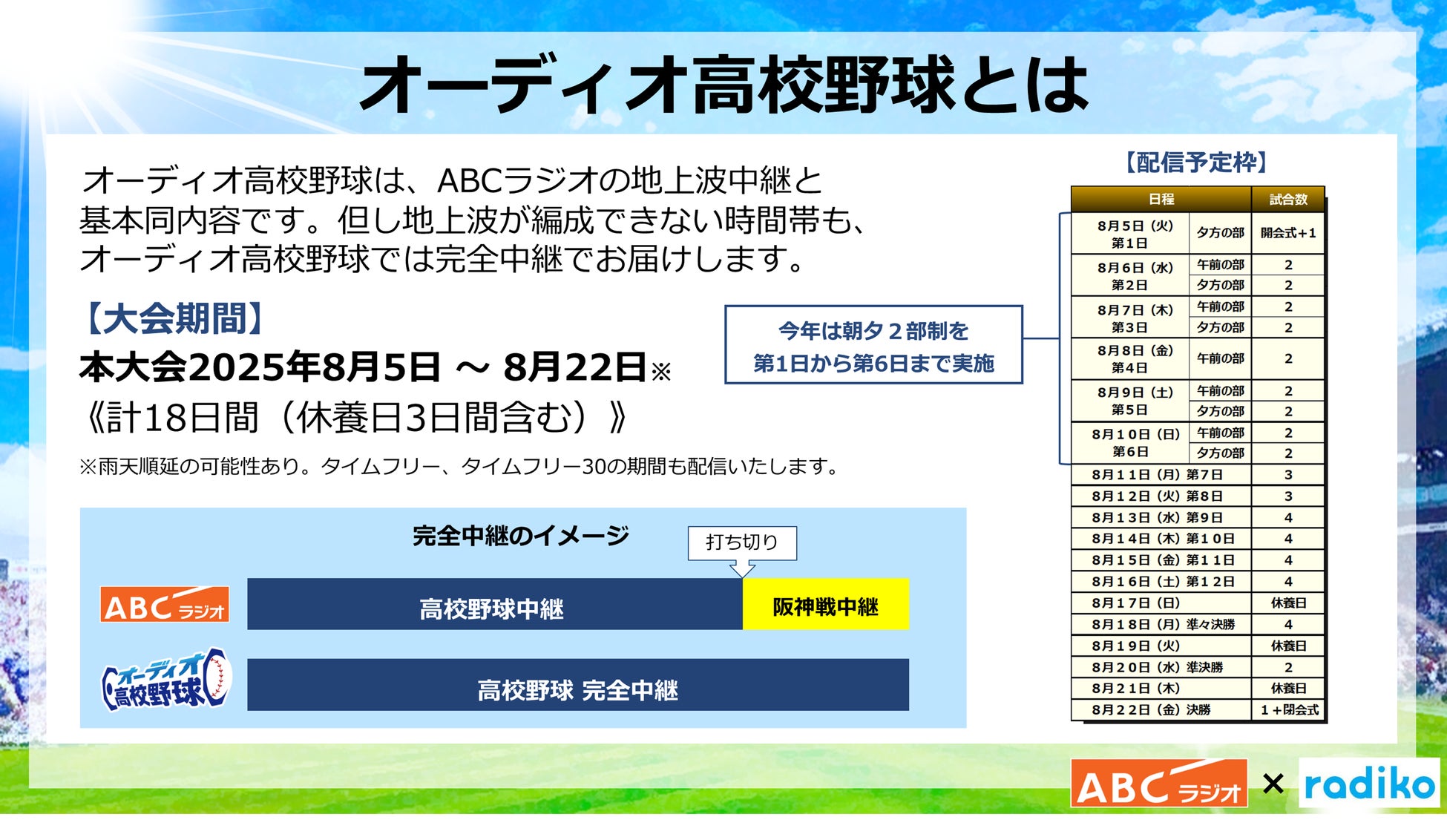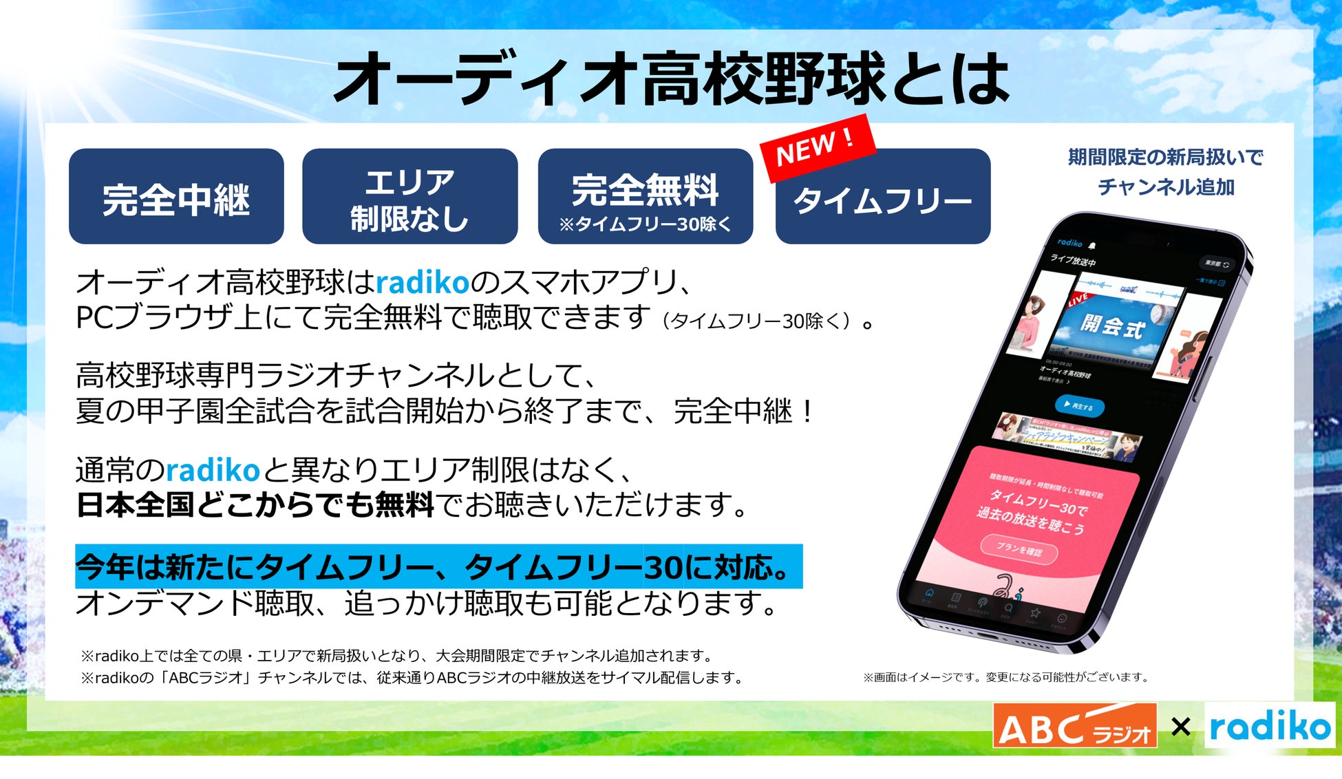 朝日放送ラジオ株式会社(以下、ABCラジオ)と株式会社radiko(以下、ラジコ)が昨年立ち上げた新サービス「オーディオ高校野球」が今年さらにパワーアップ。ラジコに特設チャンネルを設置し、第107回全国高等学校野球選手権大会を完全無料・完全中継で配信する他、過去にさかのぼって聴取可能な聴き逃しサービス、タイムフリー・タイムフリー30を新たに対応いたします。