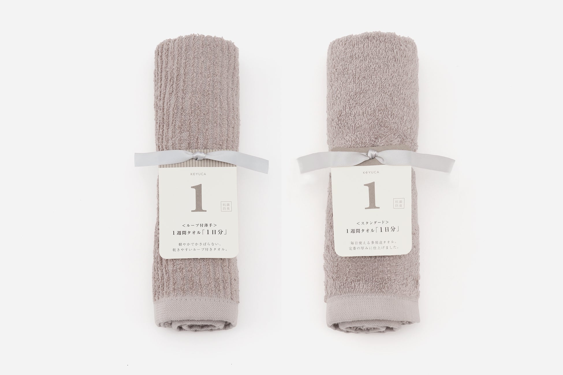 「1週間タオル」シリーズの中でもかさばらず乾きやすいタオルとして展開しているループ付き薄手タイプと、スタンダードタイプのカラー展開を統一。用途やライフスタイルでお選びいただきやすくなりました。
