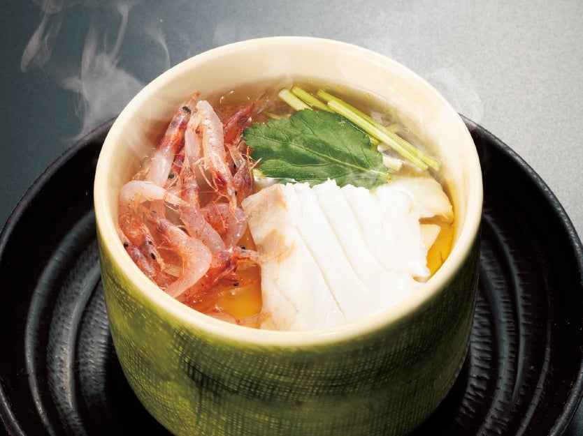 アセロラ真鯛🄬と桜えびを贅沢にたっぷり使った春限定の茶碗蒸し。出汁がきいた熱々のあんかけ仕立てです。