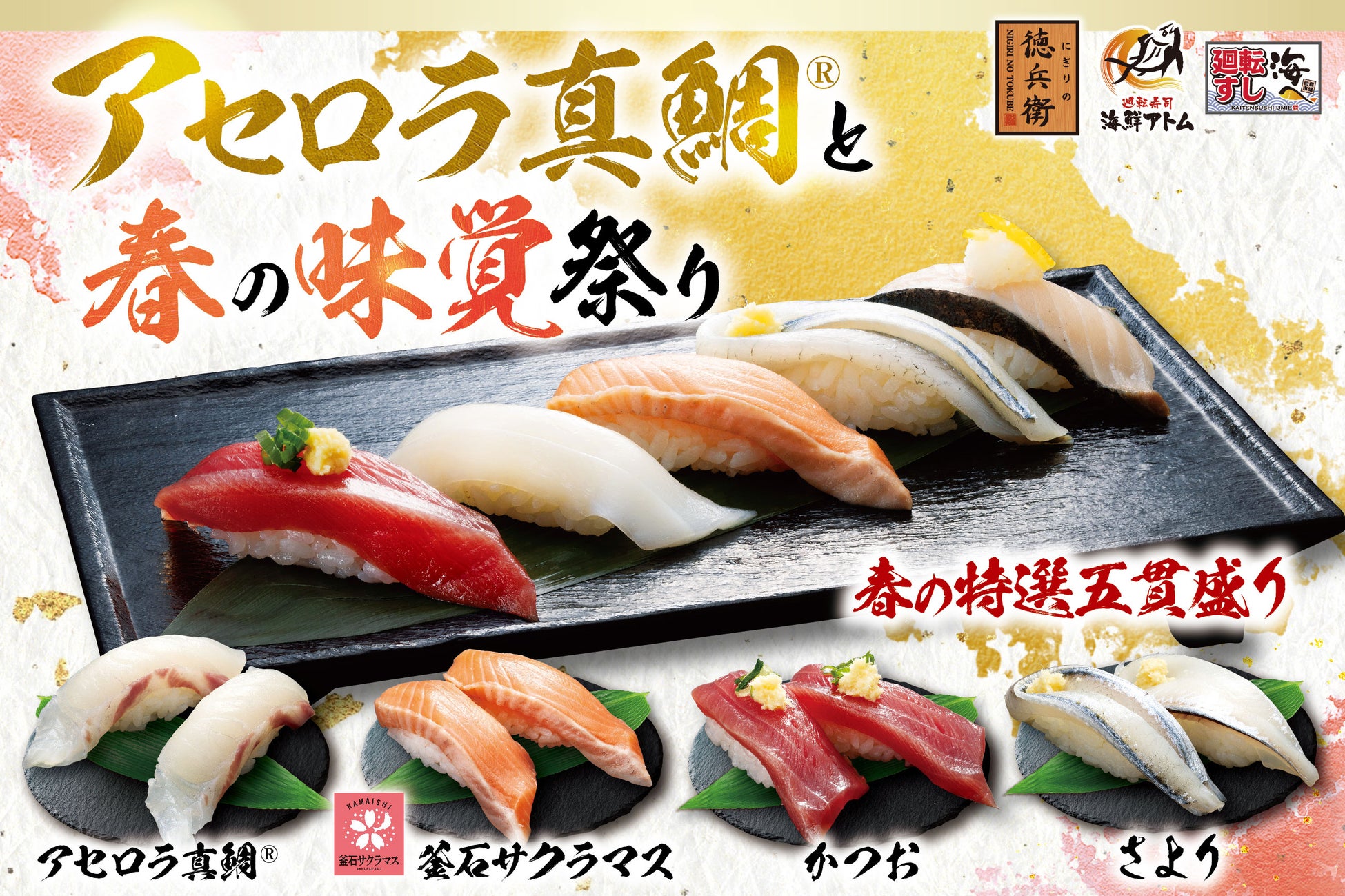 【にぎりの徳兵衛】など50店舗で春の新作寿司がお披露目!近畿大学とニチレイフーズが共同開発した「アセロラ真鯛🄬」と「釜石サクラマス」「かつお」「さより」など!「アセロラ真鯛🄬と春の味覚祭り」開催!