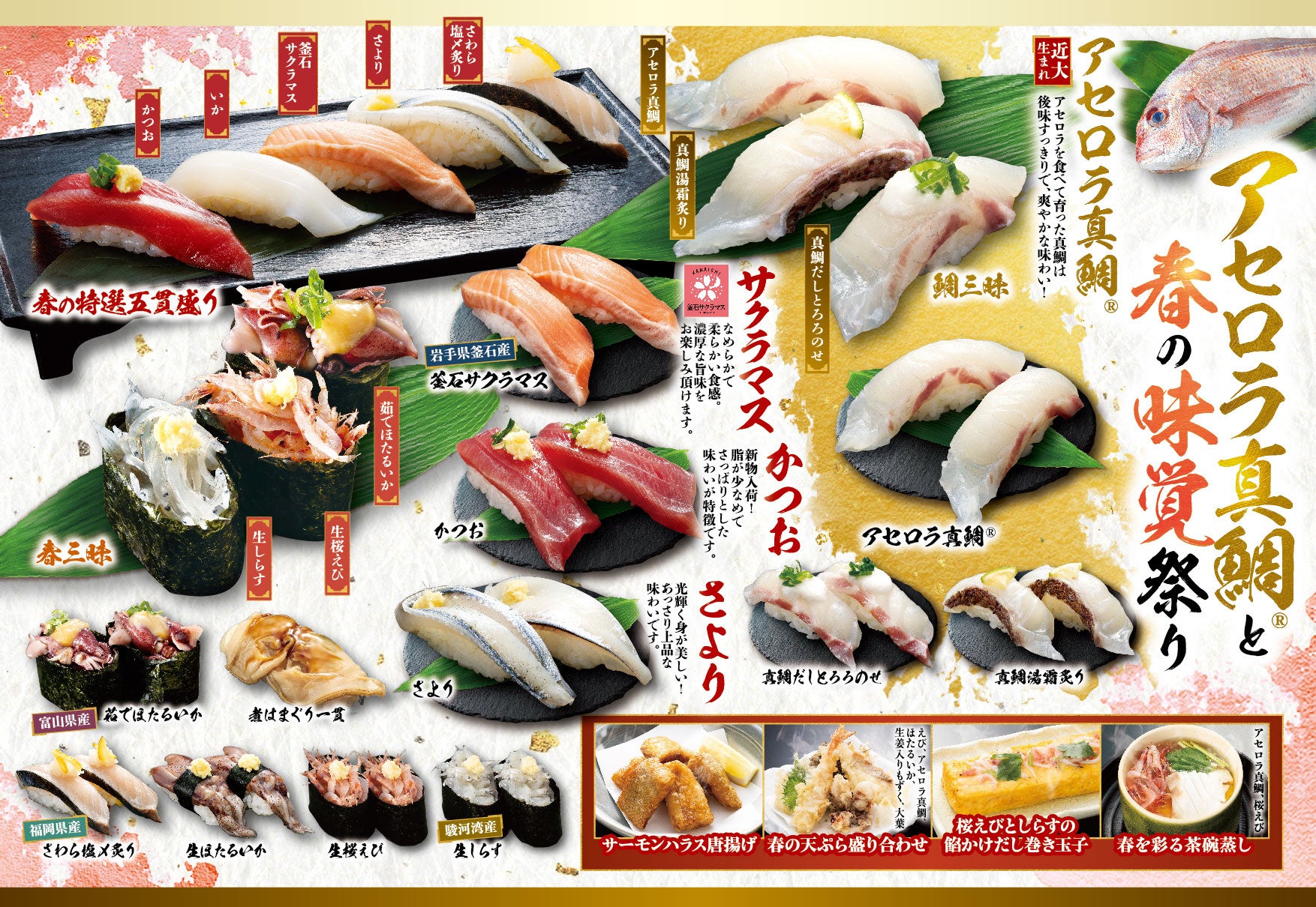 春の訪れを感じられる期間限定のお寿司が全15品登場!春と言えばやっぱり「真鯛」。その中でも当社は「アセロラ真鯛🄬」を厳選!近畿大学とニチレイフーズが共同開発した真鯛は、アセロラ果汁の搾りかす粉末を配合した餌で育てたサステナブルな商品。後味すっきりで大満足の美味しさです!