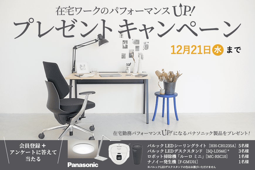 コクヨ株式会社(本社:大阪市/社長:黒田 英邦)は、11月24日(木)~12月21日(水)の期間、公式ECサイト「KOKUYO Workstyle Shop(https://workstyle.kokuyo.co.jp/)」にて、合計10名様に「LEDシーリングライト」や「ロボット掃除機」、「ナノイー発生機」が当たる「在宅ワークのパフォーマンスUP!プレゼントキャンペーン」を開催します。