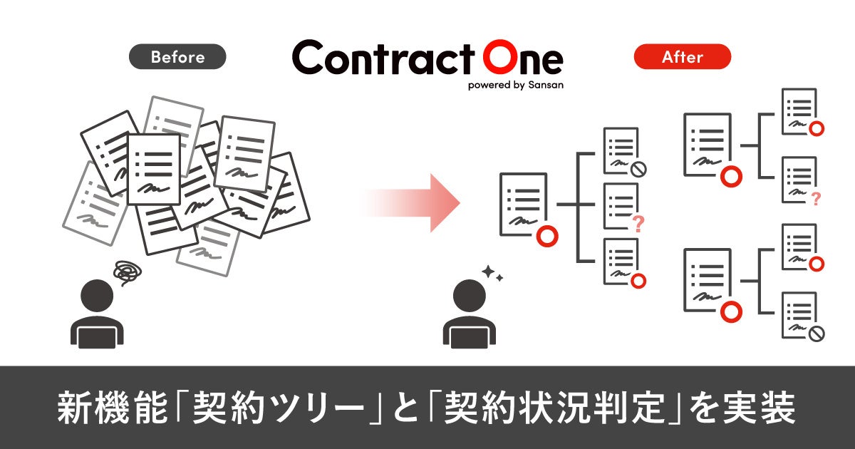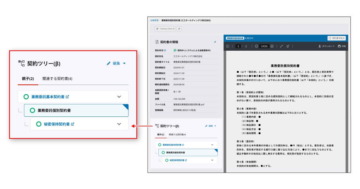 Contract Oneは、あらゆる契約書を正確に理解しデータ化することで、クラウド上での一元管理を可能とする契約データベースです。新機能によって、大量の契約情報から関連性のある契約群を自動でひも付けするとともに、各契約の有効性を自動で判定します。紙や電子に関わらず契約書をContract Oneでデータ化するだけで、案件ごとの正確な契約状況を俯瞰的に確認し、契約の有効性や期限を瞬時に把握できるようになります。Contract Oneで契約データベースを構築することにより、必要な契約書を見つけられないなどの属人的な管理に起因するリスクを軽減するとともに、契約業務の効率化によるコスト削減や、契約状況に基づく契約の統廃合や見直し、契約情報を活用した取引先との交渉を推進するなど、収益向上に貢献します。