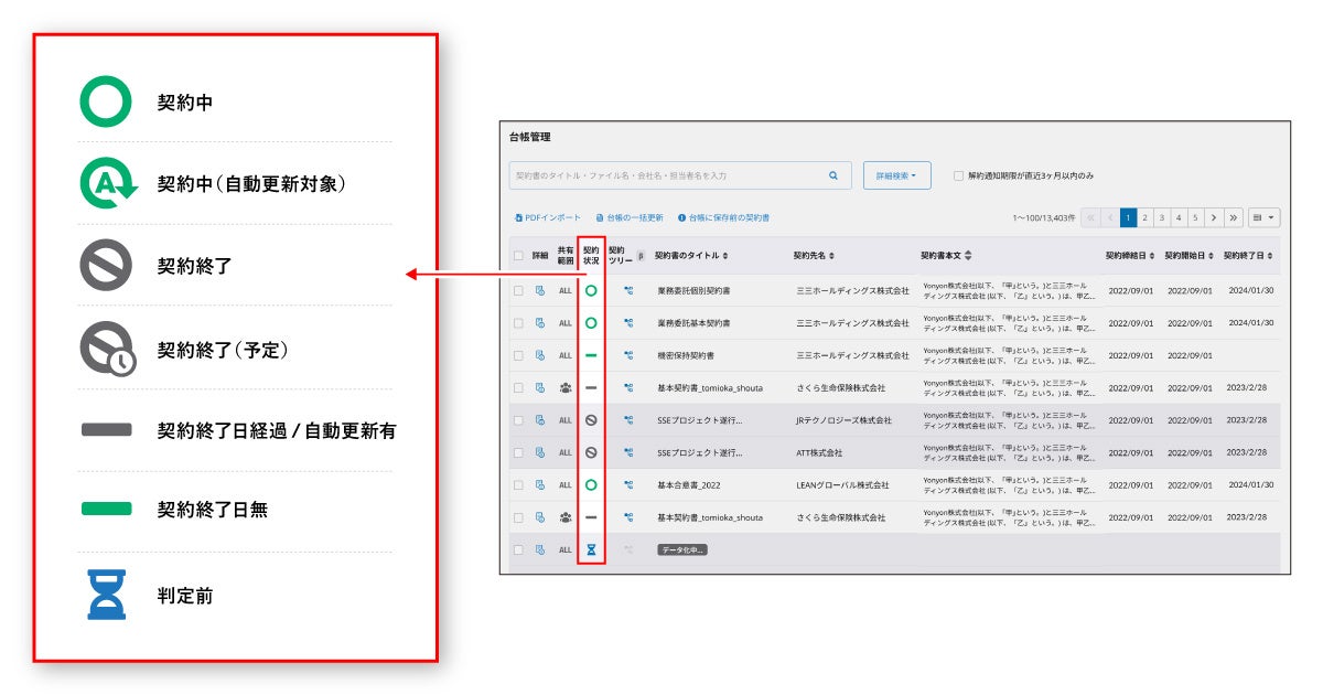 データベース化した契約情報から、契約終了日や自動更新の有無、自動更新期間などを自動で読み取り、各契約のステータスを「契約中」「契約終了」に自動で分類します。終了日の記載がない場合は「契約終了日無」と表示されます。契約終了日が経過しているが自動更新の定めがあるもの、すなわち意図せず自動更新されている可能性がある契約書は「契約終了日経過/自動更新有」と表示されます。担当者は各ステータスを確認後、契約を終了するか再締結するかを判断し、不明確な取引を適正化できます。既に実装済みの「自動更新管理」(※3)と組み合わせて活用することで、契約が自動で更新し続けるリスクをより軽減することが可能となります。