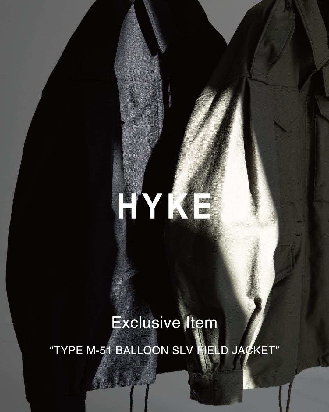 今回の別注ではHYKEの定番アイテム、TYPE M-51 FIELD JACKETをベースに袖を大胆なBALLOONシルエットに変更したエクスクルーシブモデルです。