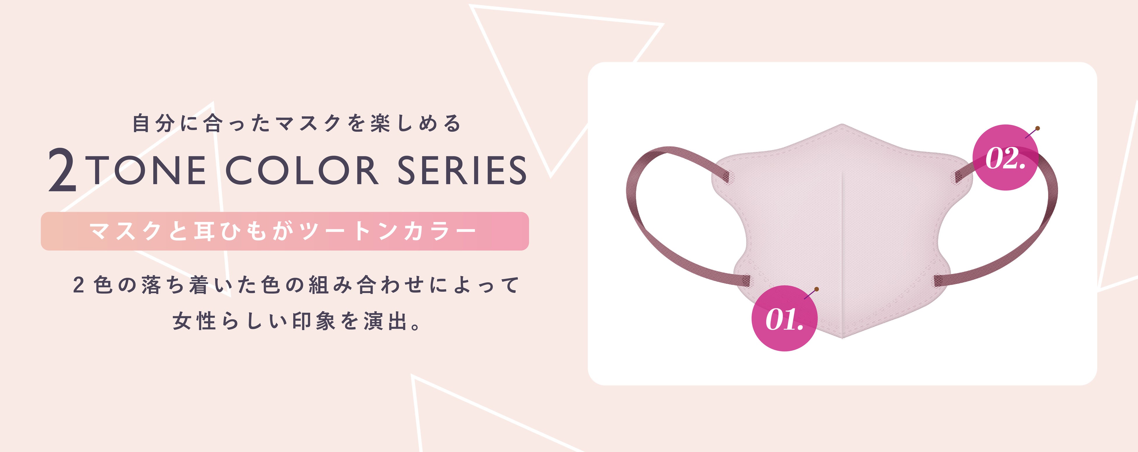 マスク本体と耳ひもがツートンカラーになった2つの配色は、落ち着いた色の組み合わせによって女性らしい印象を演出します。約0.1㎛(マイクロメートル)サイズの粒子を99.9%ろ過(捕集)できるフィルターを採用し、国際的な基準を満たした証明のISO(9001)と、適正な商品であることを証明するCE/FDAマークを取得し、徹底した品質管理の下に生産された安全な不織布マスクです。