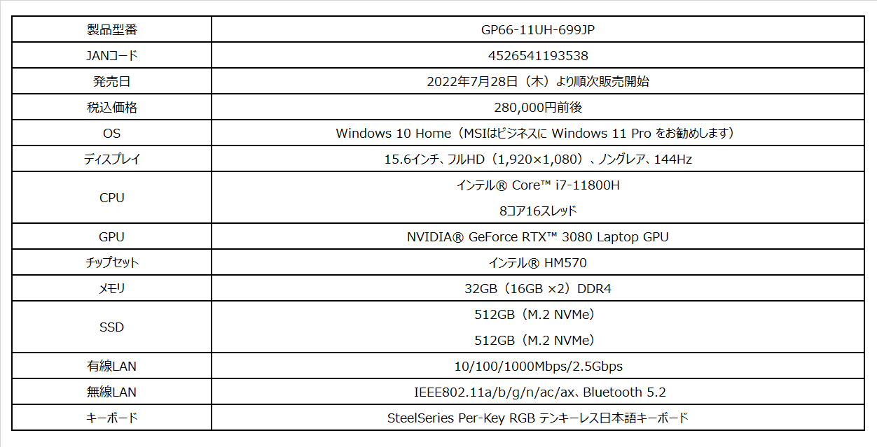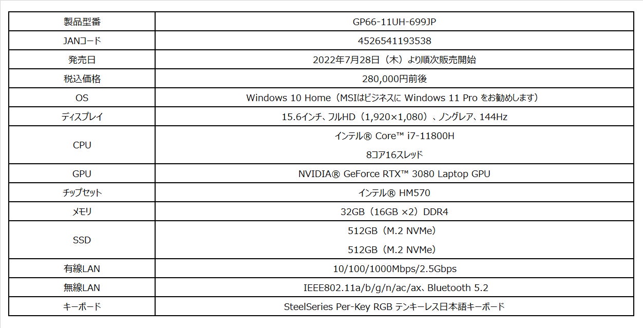 「GeForce RTX™ 3080 Laptop GPU」を搭載しつつコストパフォーマンスを追求 超ハイスペックゲーミングノートPC「GP66-11UH-699JP」発売