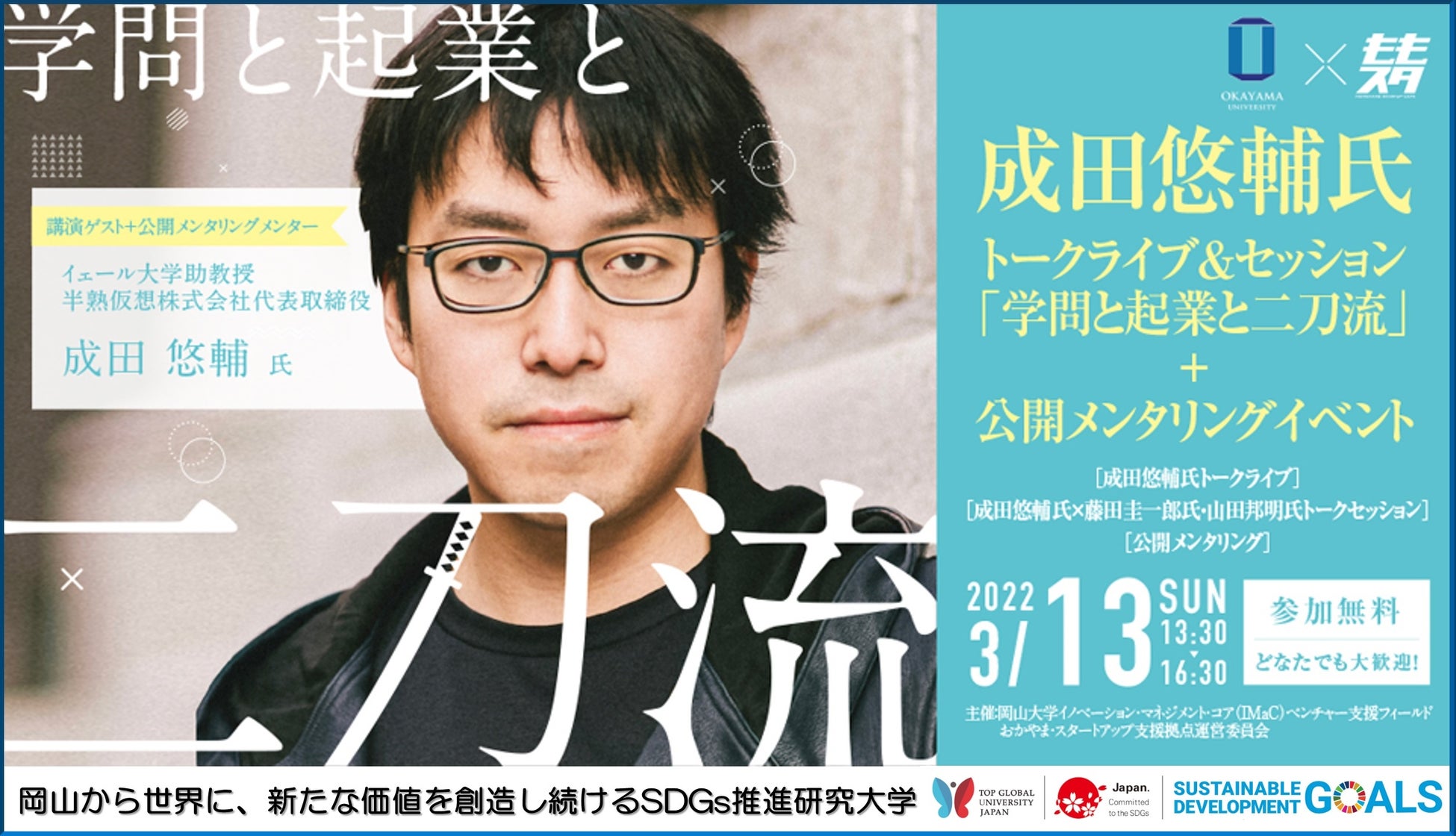 国立大学法人岡山大学(本部:岡山市北区、学長:槇野博史)のイノベーションマネジメントコア(IMaC)ベンチャー支援フィールドでは、「おかやまスタートアップ支援拠点運営委員会」と連携し、気鋭の論客・成田悠輔イェール大学助教授によるトークライブ&セッションと、起業の臨場感を体感していただく「公開メンタリング」イベントを2022年3月13日(日)、オフラインとオンライン(ZOOM)のハイブリッドで実施します。