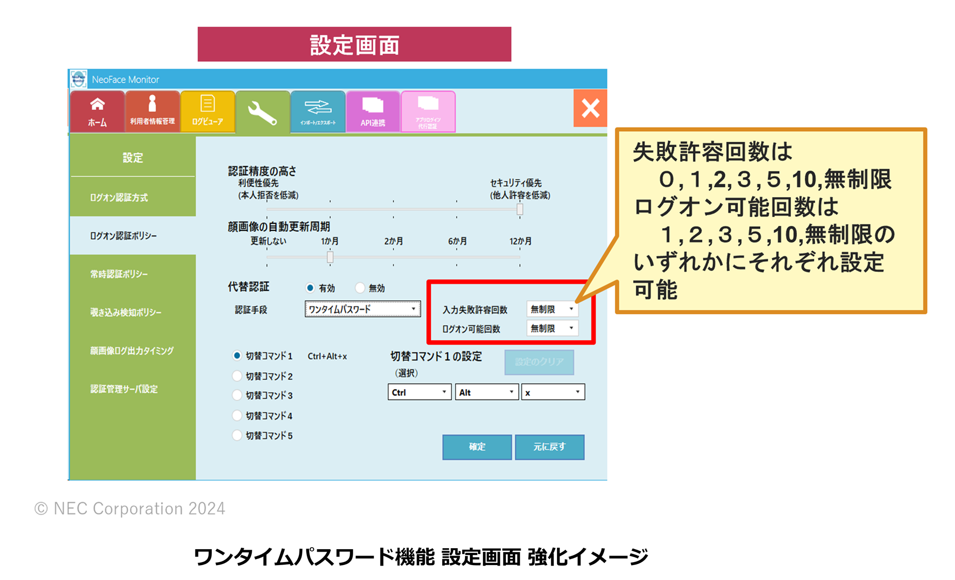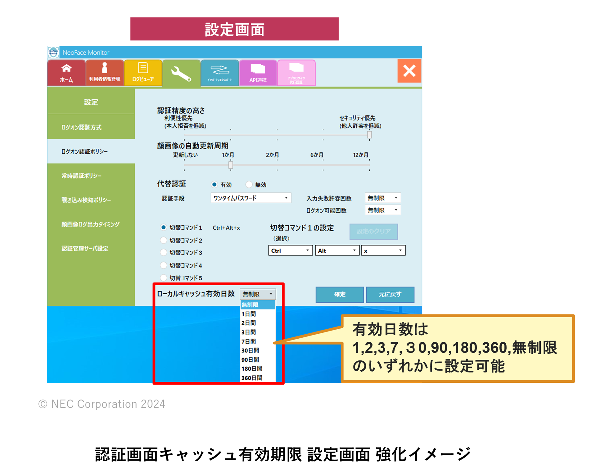 顔認証が使用できない場合の代替認証手段として用意しているワンタイムパスワード機能では、入力失敗許容回数やログオン可能回数を設定できるようになり(注3)、ネットワークが利用できない場合にあらかじめ保持した情報で認証するキャッシュ認証機能では、保持した情報の有効期限を設定できるようになりました(注4)。