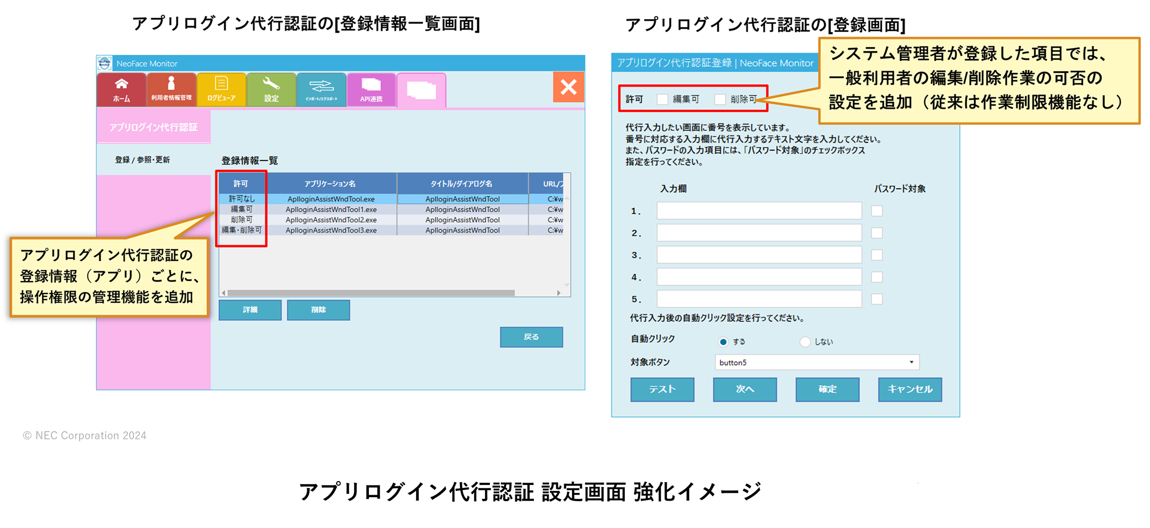 アプリログイン代行認証機能では、管理者が特定のアプリケーションにおいて顔認証適用の必須化を行えるよう登録権限の管理を強化しました。
