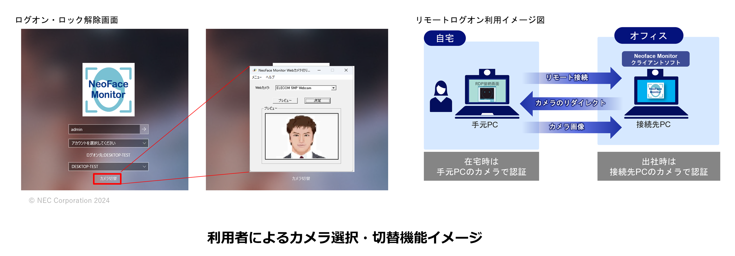 また、ログオンや画面ロック解除で顔認証を利用する際、自宅や職場など場所によってPC内蔵カメラや大画面の拡張ディスプレイに付随するカメラを使い分けたり、タブレットPCの前面、背面カメラを使い分けるなど、管理者権限を有していない利用者でもカメラを切り替えられる機能を新たに追加し、利便性を向上しました。