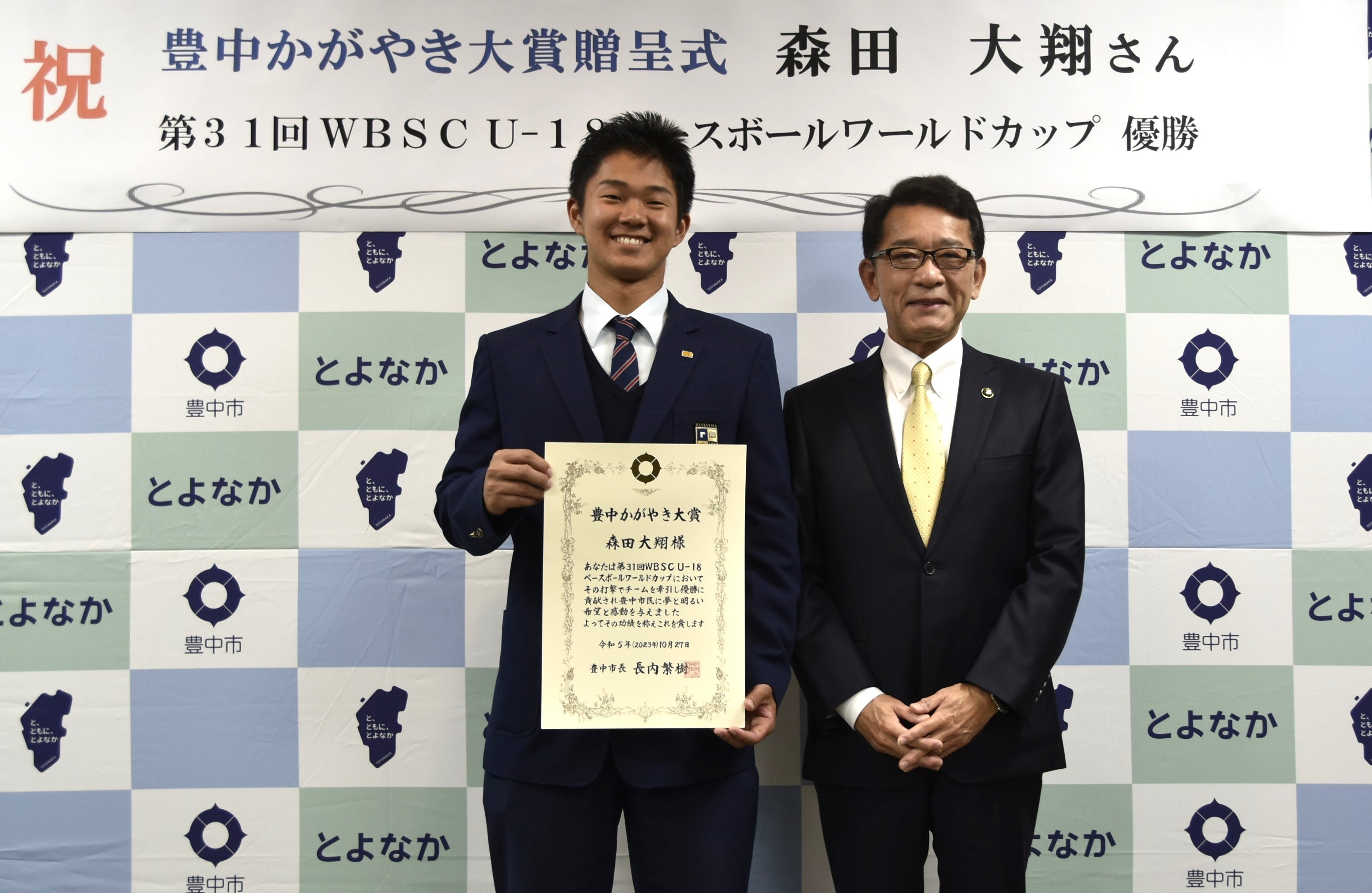 森田大翔選手 U-18野球W杯 初優勝に貢献 「豊中かがやき大賞」を贈呈