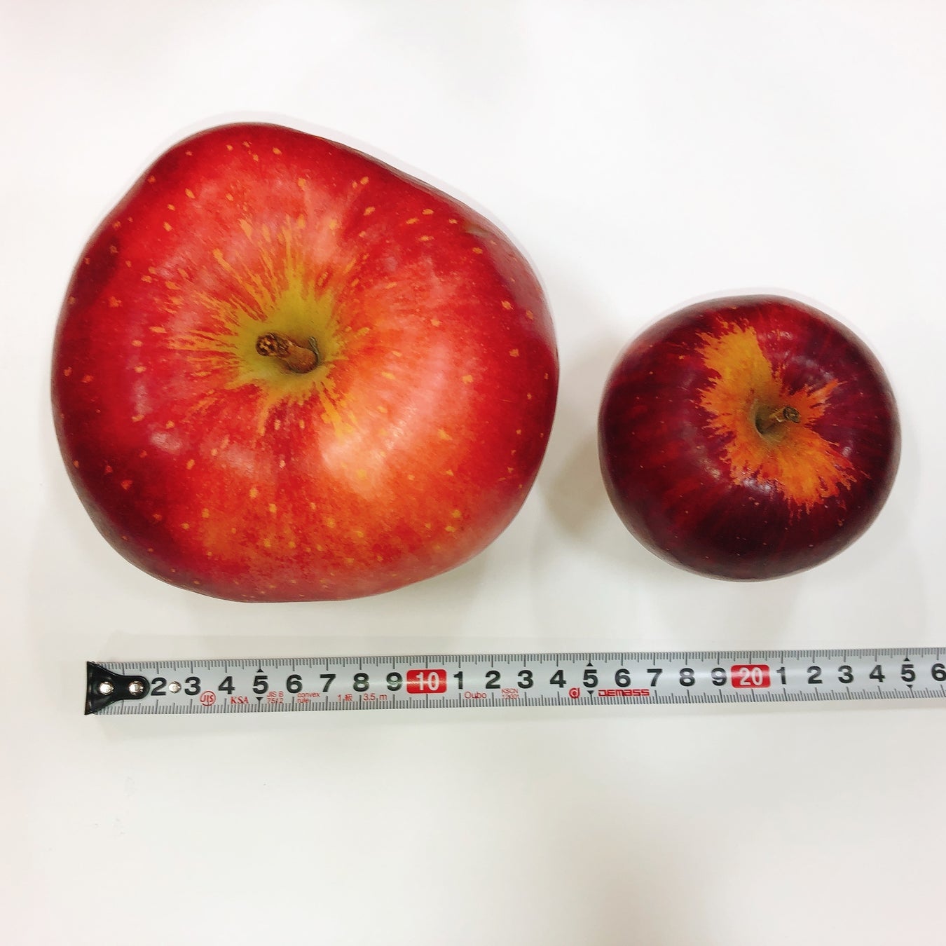 小さいもので350gくらいあり、大きめのものは500~600gほどで、特に大玉のものは 1kg 近くになることもあるといわれています。(通常のりんごは300g 程度)