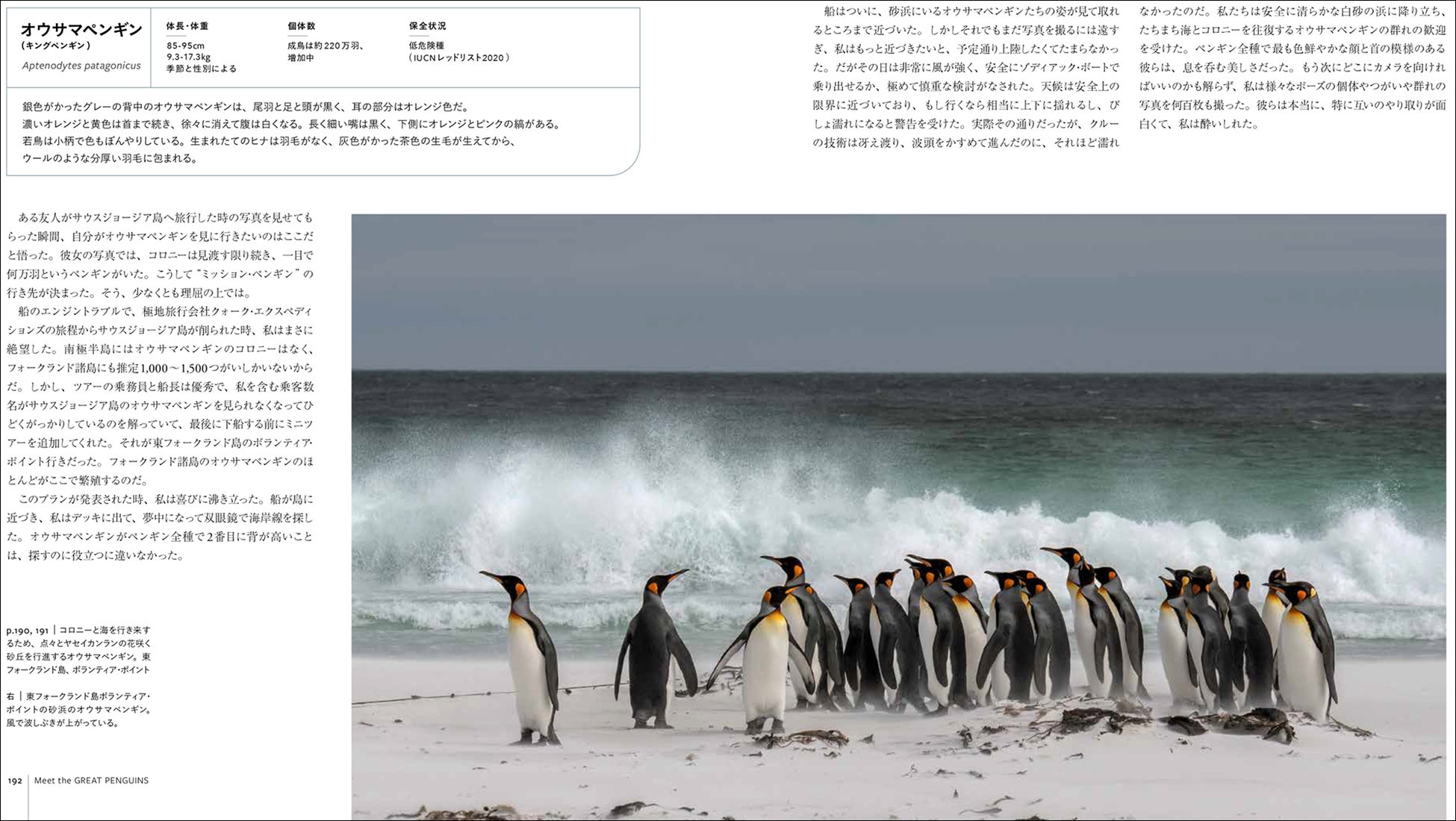 ケープペンギン、マゼランペンギンなど帯模様のあるペンギンや、ヒゲペンギンなど尾羽の長いペンギンなど、種類別に特徴や繁殖、主な脅威など、著者のコメントなどを交えて紹介。躍動感のある写真も見どころです。