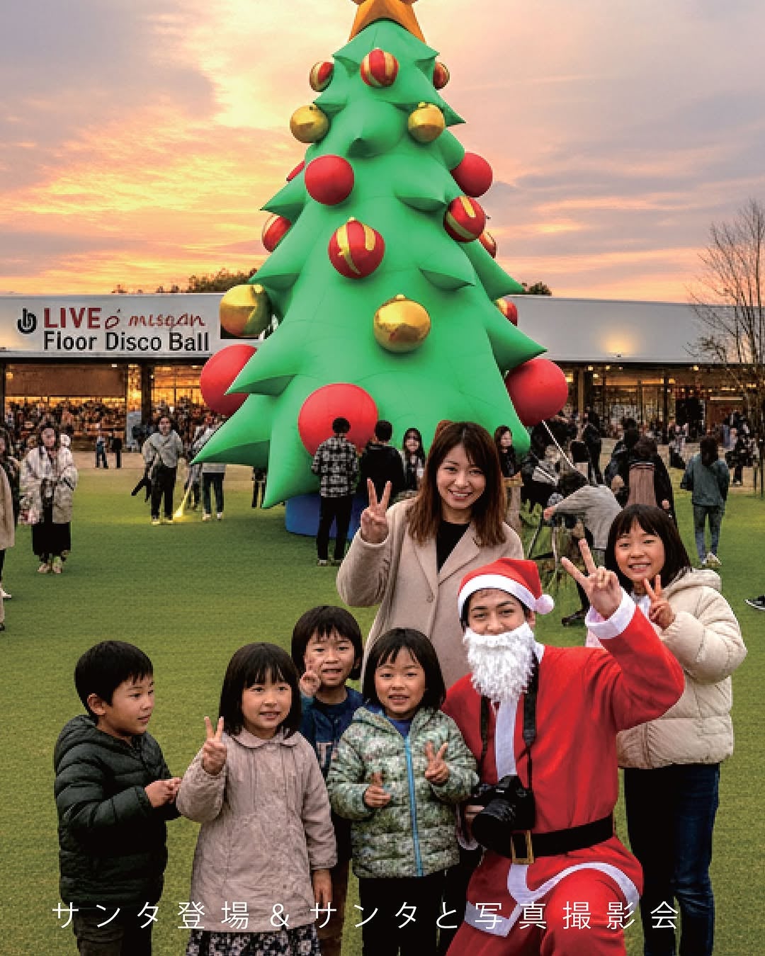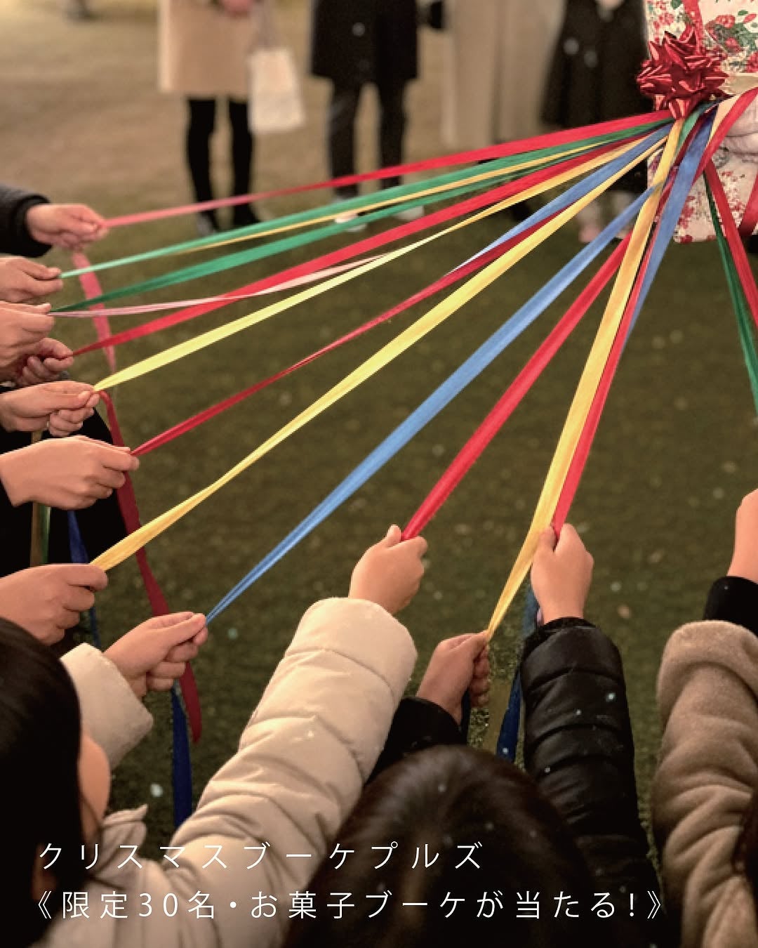音楽に包まれる幻想的なライトアップをはじめ、サンタとの写真撮影会や先着順でホットココアプレゼント、限定30名に当たる「クリスマスブーケプルズ」、さらにマーケットも同時開催されるなど、冬の夜をまるごと楽しめる内容です。