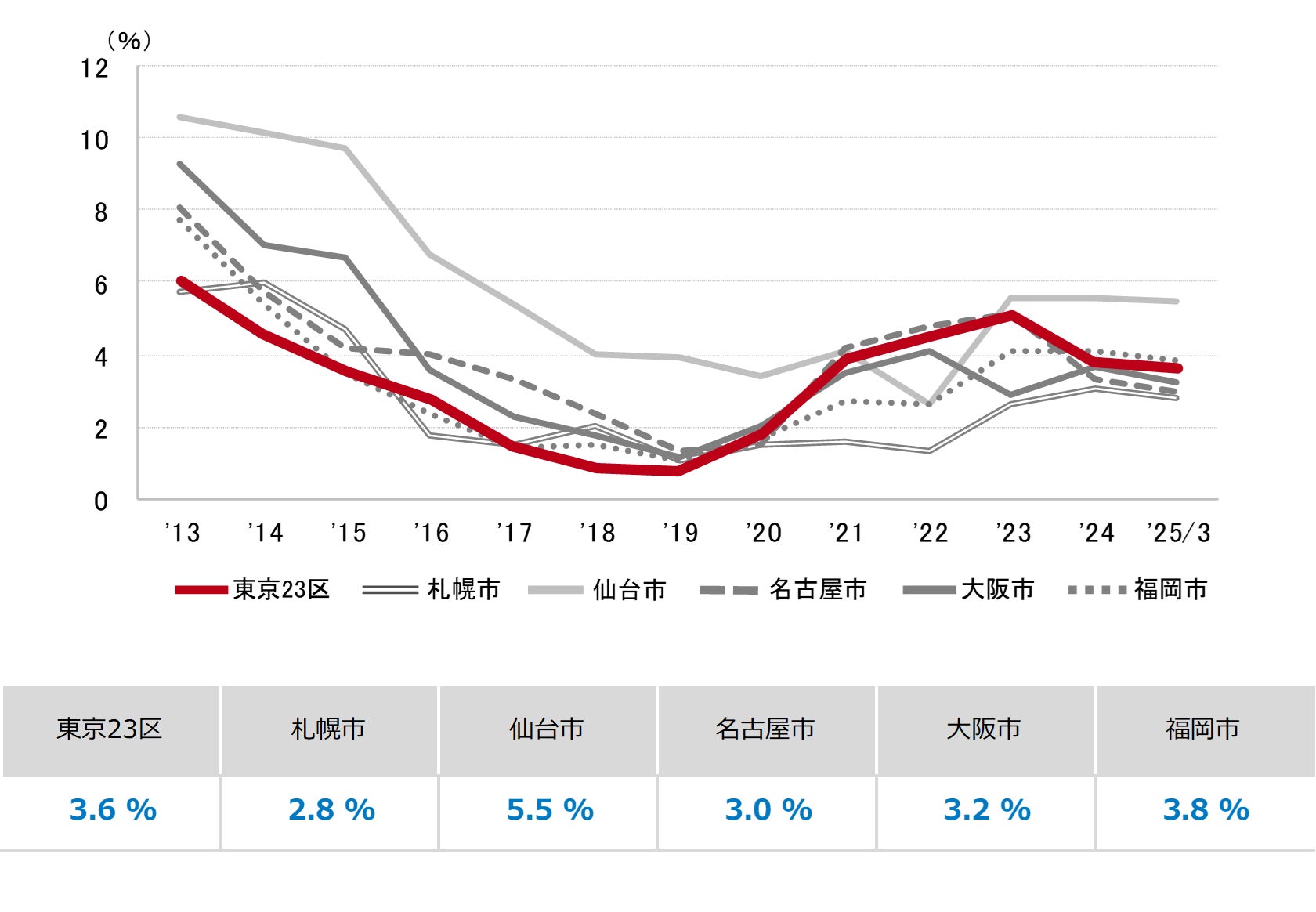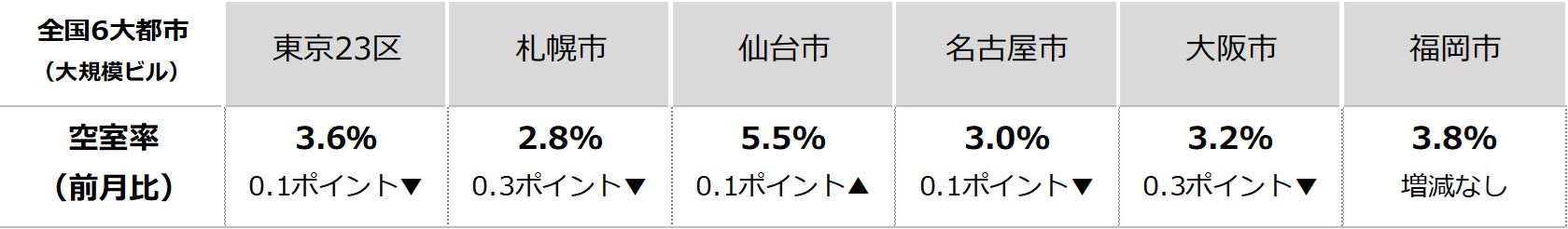 三幸エステート株式会社(本社:東京都中央区、取締役社長:武井重夫)は、2025年3月度の東京都心5区(千代田区、中央区、港区、新宿区、渋谷区)および全国6大都市(東京、札幌、仙台、名古屋、大阪、福岡)の大規模ビル※1のマーケットデータをまとめた「オフィスマーケット2025年4月号」を公表します。