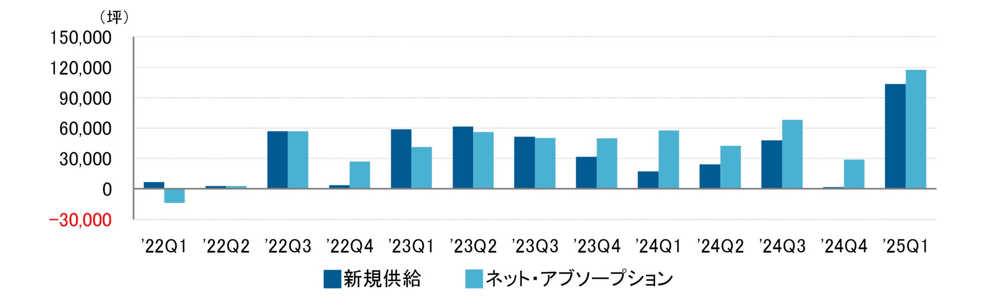 ネット・アブソープション(吸収需要)はオフィス需要の指標であり、一定期間におけるテナント入居面積(稼働面積)の増減を表す。直近2025年第1四半期の吸収需要は約12万坪の高水準で、10万坪を超えるのは2018年第3四半期以来となる。需要が供給を上回る需要超過は、2023年第4四半期から6期連続となった。オフィス需要には引き続き力強さが見られる。
