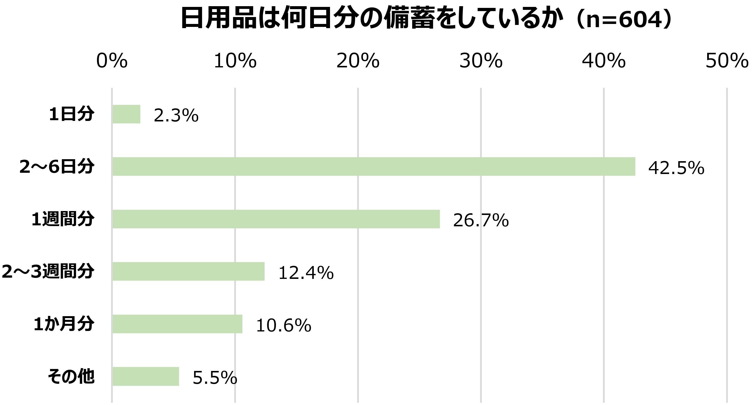 ・何日分の備蓄をしているか聞いたところ、「2~6日分」が約4割(42.5%)と最も多い結果となりました。次いで「1週間分」の備蓄をしている人が多く、「2~3週間分」と「1か月分」を合わせると、半数の人が「1週間分以上」の備蓄をしていることも分かりました。