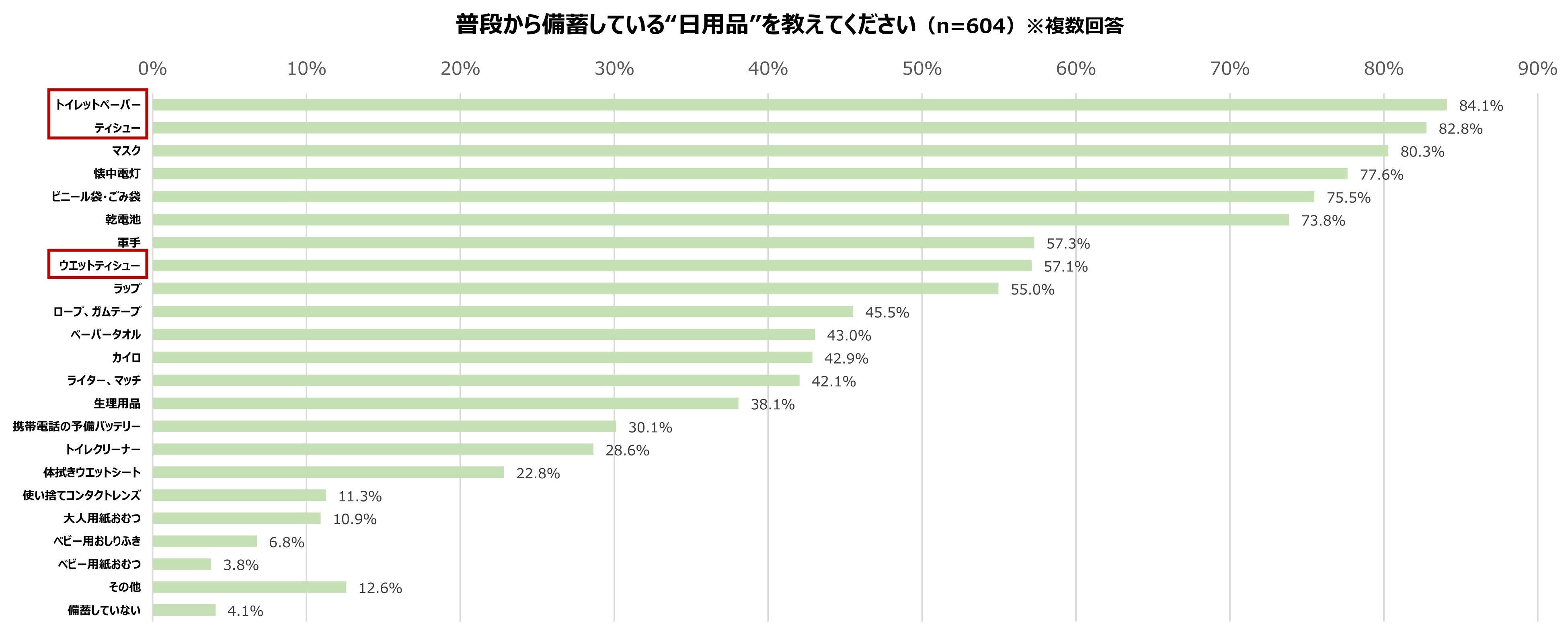■トイレットペーパーとティシューを8割以上の人が備蓄。水や食料品以外の備蓄必需品に