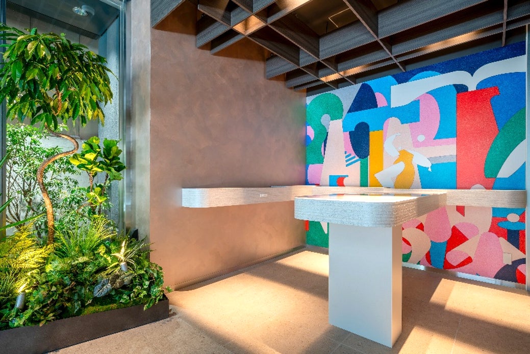 刺激する壁面アートやアップサイクル材を活用したカウンターを設え、デザイン性とサステナビ