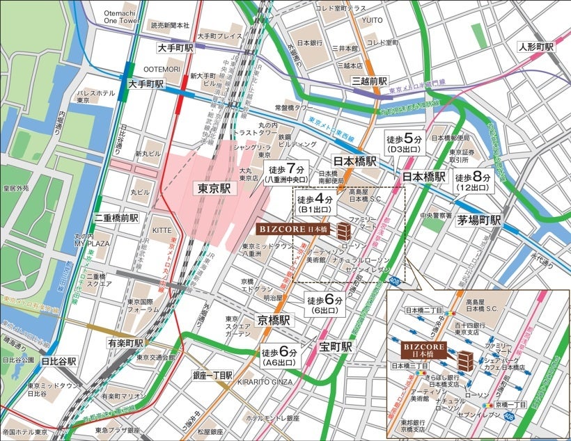 ・複数路線を利用可能な「日本橋」「東京」駅に近接し、都市交通の各方面へ優れたアクセスを