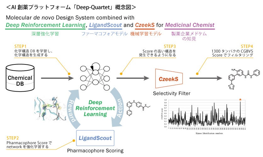 AI創薬プラットフォーム「Deep Quartet」は、インテージヘルスケアと株式会社理論創薬研究所、株式会社アフィニティサイエンスが3社連携で提供するサービスです。「Deep Quartet」は、深層強化学習の技術である(1)Deep reinforcement learning、ファーマコフォアモデルを用いるソフトウェア(2)LigandScout、網羅的なターゲット予測を可能とする機械学習ベースの技術(3)CzeekSを組み合わせた一連のフローであり、ここに(4)メディシナルケミスト(有機合成化学者)の知見を加えることで、Quartet(四重奏)によるAI創薬プラットフォームを実現しています。