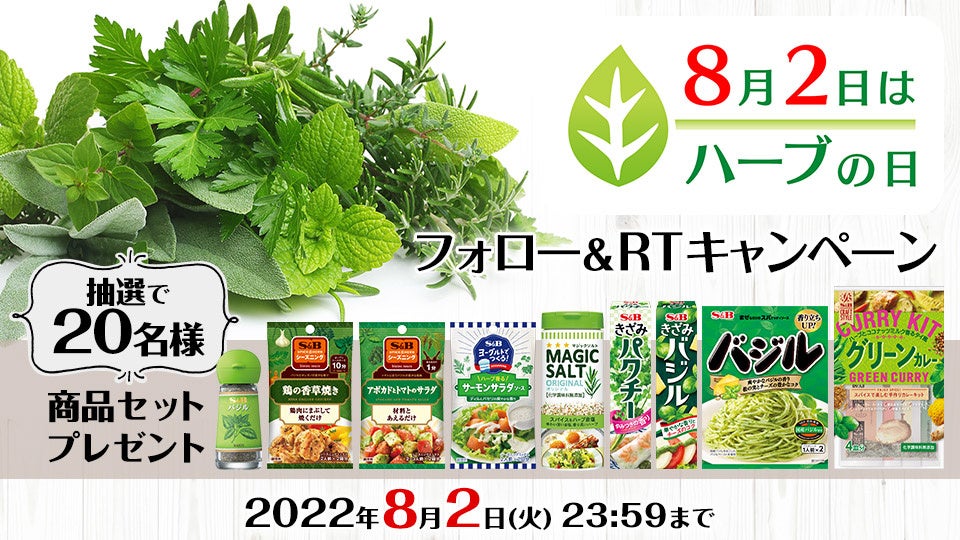 [カレンダー が含まれている画像 自動的に生成された説明] 「ハーブの日」を記念して、8月2日限定でエスビー食品のハーブ関連商品セットが当たるプレゼントキャンペーンを、エスビー食品公式 Twitterで実施します。