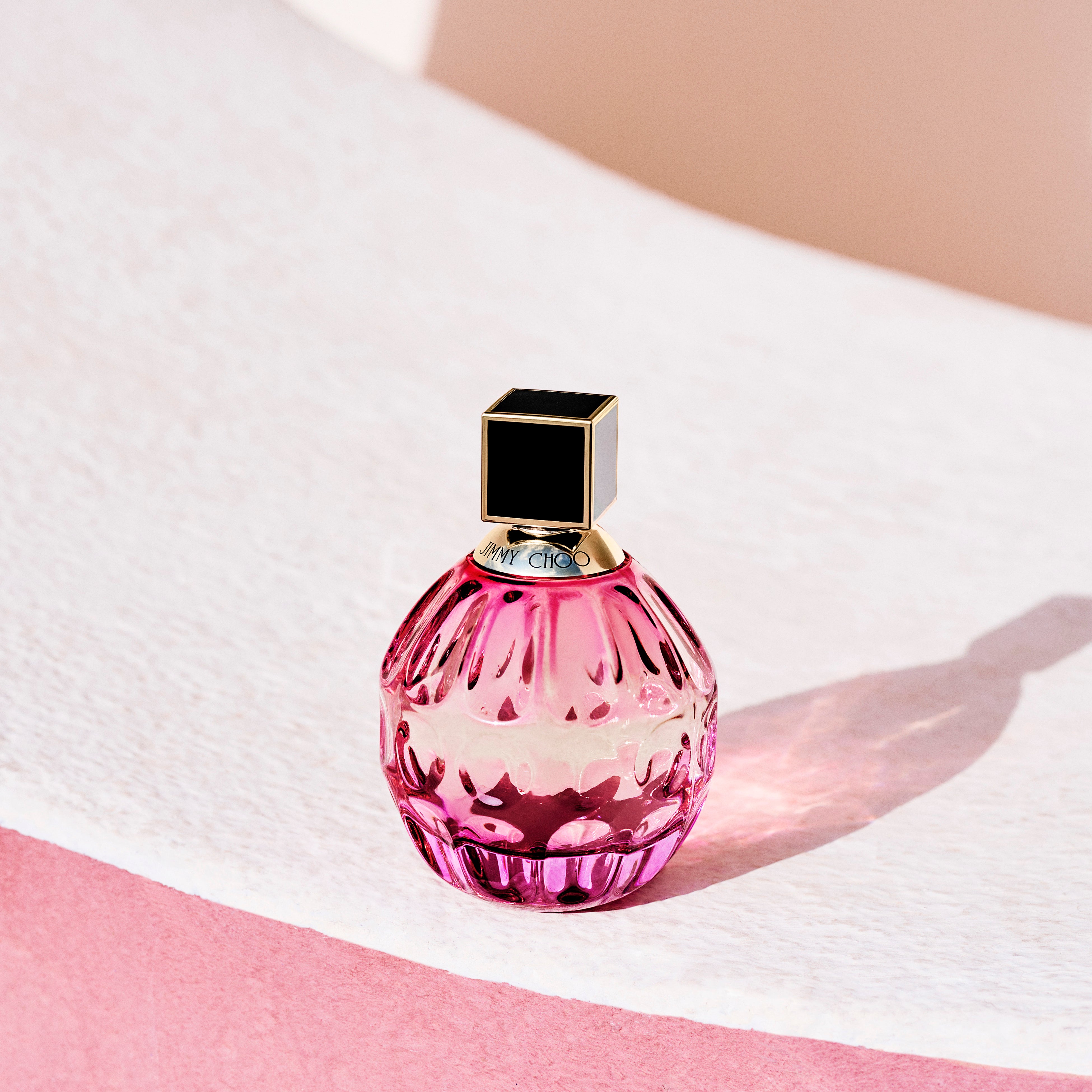 フューシャピンクの外箱とボトルのパッケージには、高い品質と職人技の証でもあるジミー チュウのブランド名を施すとともに、大胆な質感のデザインを取り入れています。ヴェネチアングラスからインスパイアされたボトルは、美しくカットされたクリスタルジュエリーを思い起こさせるとともに、フューシャピンクのダブルグラデーションによって、ボトルが内側から輝いて見えるようにデザインされました。さらに、艶のあるブラックとゴールドのキャップを組み合わせ、香りと同じように、自信あふれる雰囲気に仕上げています。