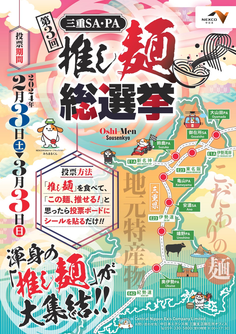 中日本エクシス株式会社 三重支店(三重県四日市市鵜の森、支店長・山本(やまもと)武司(たけし))は、三重県内のサービスエリア(SA)パーキングエリア(PA)の店舗(一部除く)において、昨年度大好評であった、自慢の麺料理を競い合いNo.1を決定する“第3回 三重SA・PA 推し麺総選挙”を開催します。
