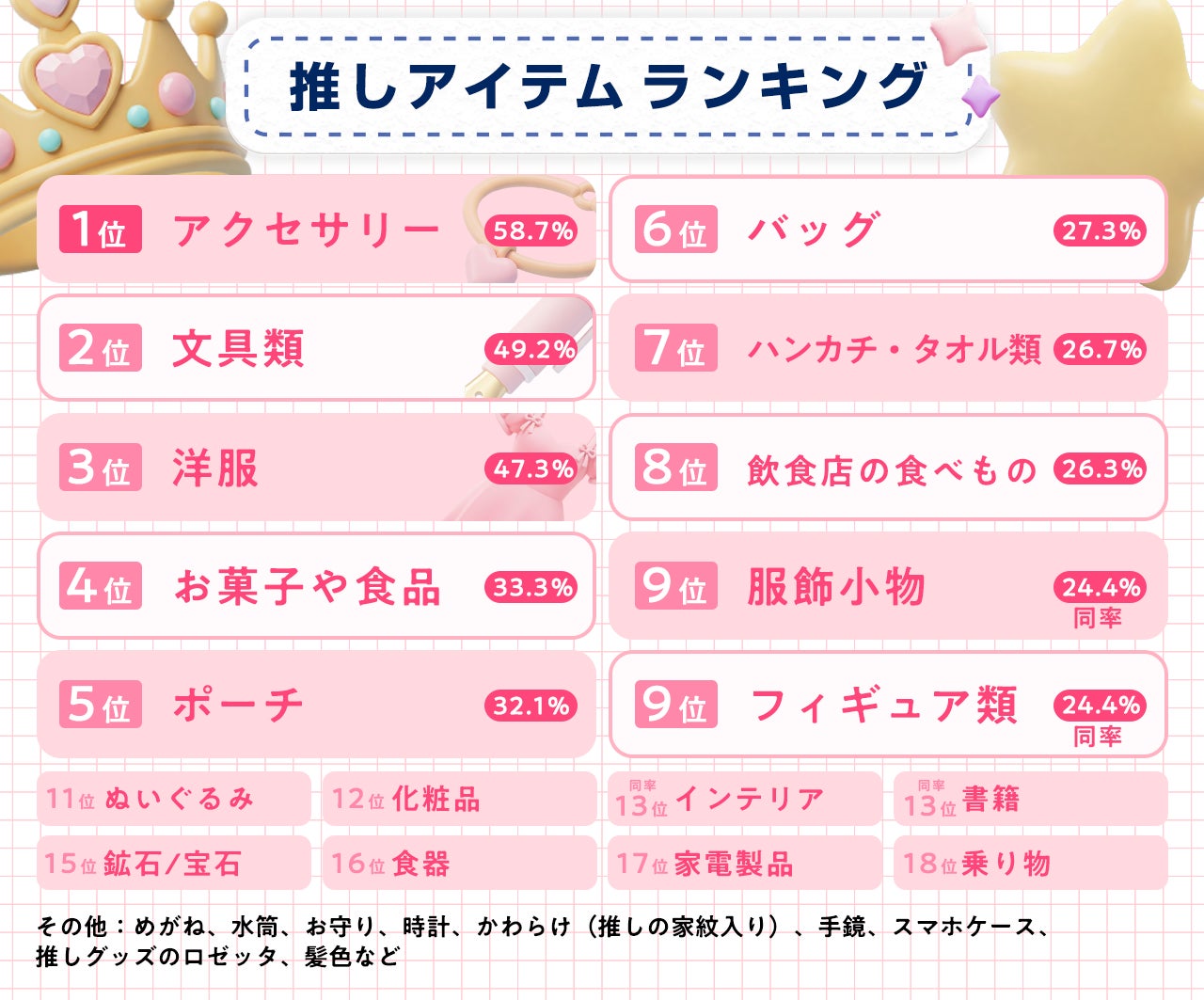 1位アクセサリー(58.7%)2位文具類(49.2%) 3位洋服(47.3%)4位お菓子や食品(33.3%)5位ポーチ(32.1%)6位バッグ(27.3%)7位ハンカチ・タオル類(26.7%)8位飲食店の食べもの(26.3%)9位 服飾小物・フィギュア類(同率24.4%)11位ぬいぐるみ(21.9%)12位化粧品(21.3%)13位インテリア・書籍(同率9.5%)15位鉱石/宝石(7.9%)16位食器(6.3%)17位家電製品(2.9%)18位乗り物(1.0%)