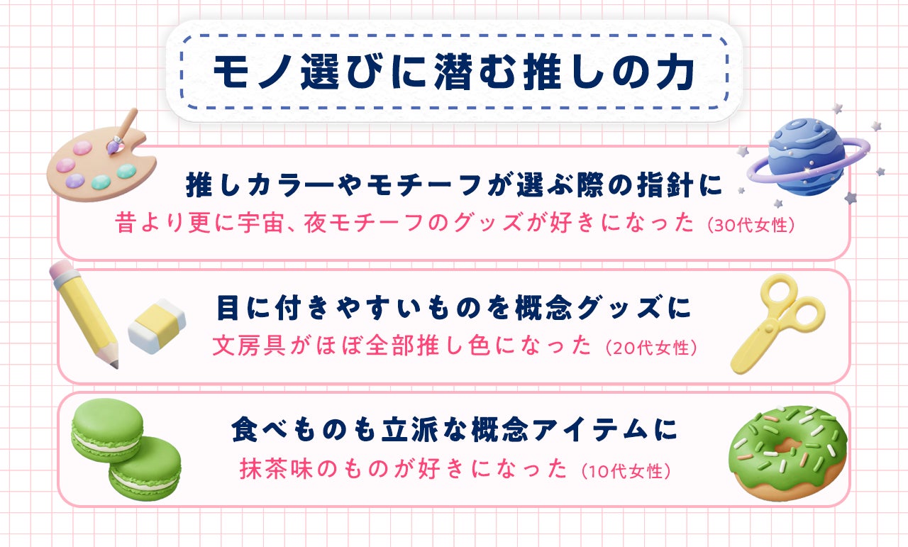 ふとしたきっかけで手に取ったアイテムも、推しカラーだったり、推しを連想させるモチーフだったりするだけで、特別な意味を持つものに変わる…そんな、推しの力を改めて感じる調査結果となりました。
