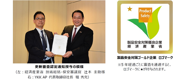 YKK AP株式会社(本社:東京都千代田区、社長:堀 秀充)は、経済産業省が主催する「製品安全対策優良企業表彰(PSアワード)」において、「製品安全対策ゴールド企業」の認定から5年ごとに実施されるフォローアップ審査により、取り組みの継続・発展が認められ、認定継続となりましたのでお知らせします。