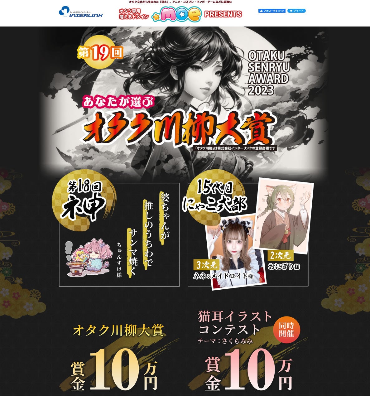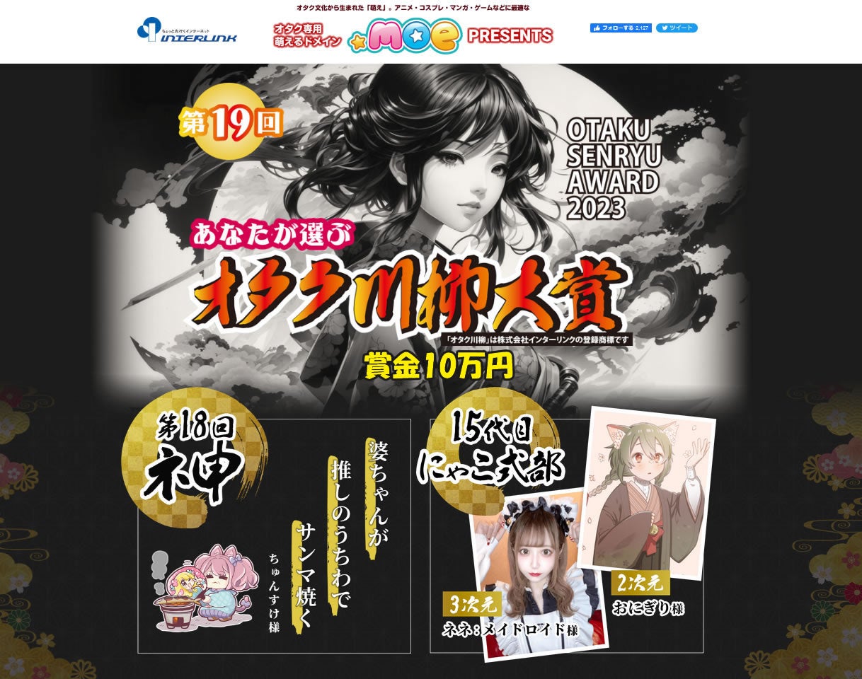 ドメイン「.moe」、「.osaka」、「.earth」の運営や上級者向け(使う人のあまりいない)の特殊な(微妙な)サービスを提供する、インターネットサービスプロバイダーの株式会社インターリンク (東京都豊島区、代表取締役社長:横山正、以下インターリンク)は、「第19回 あなたが選ぶオタク川柳大賞」(以下、オタク川柳)の応募受付を10月10日午前11時より開始いたします。