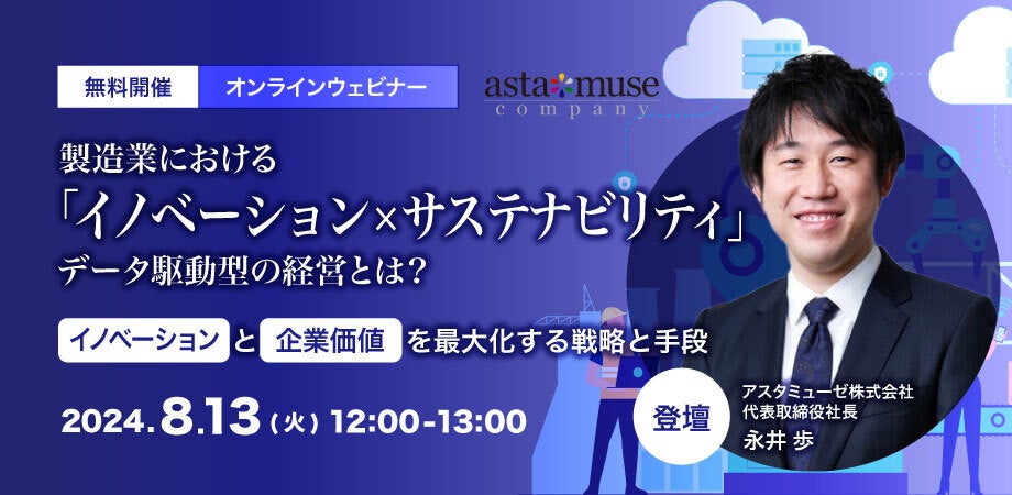 アスタミューゼ株式会社(本社:東京都千代田区、代表取締役社長 永井歩)は、2024年8月13日(火)12:00-13:00に、無料ウェビナー「製造業における「イノベーション × サステナビリティ」データ駆動型の経営とは?~イノベーションと企業価値を最大化する戦略と手段~ 」を開催いたします。