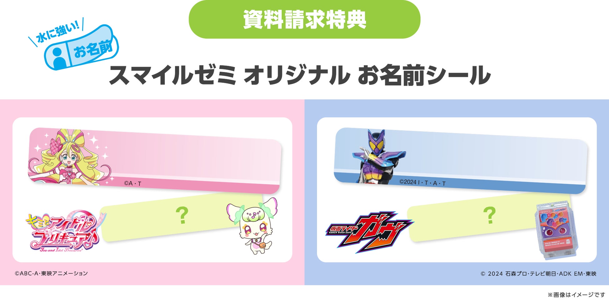 対象コースの資料請求をしていただいた方全員に、「キミとアイドルプリキュア♪」と「仮面ライダーガヴ」の「スマイルゼミ オリジナル防水お名前シール」をプレゼントします。