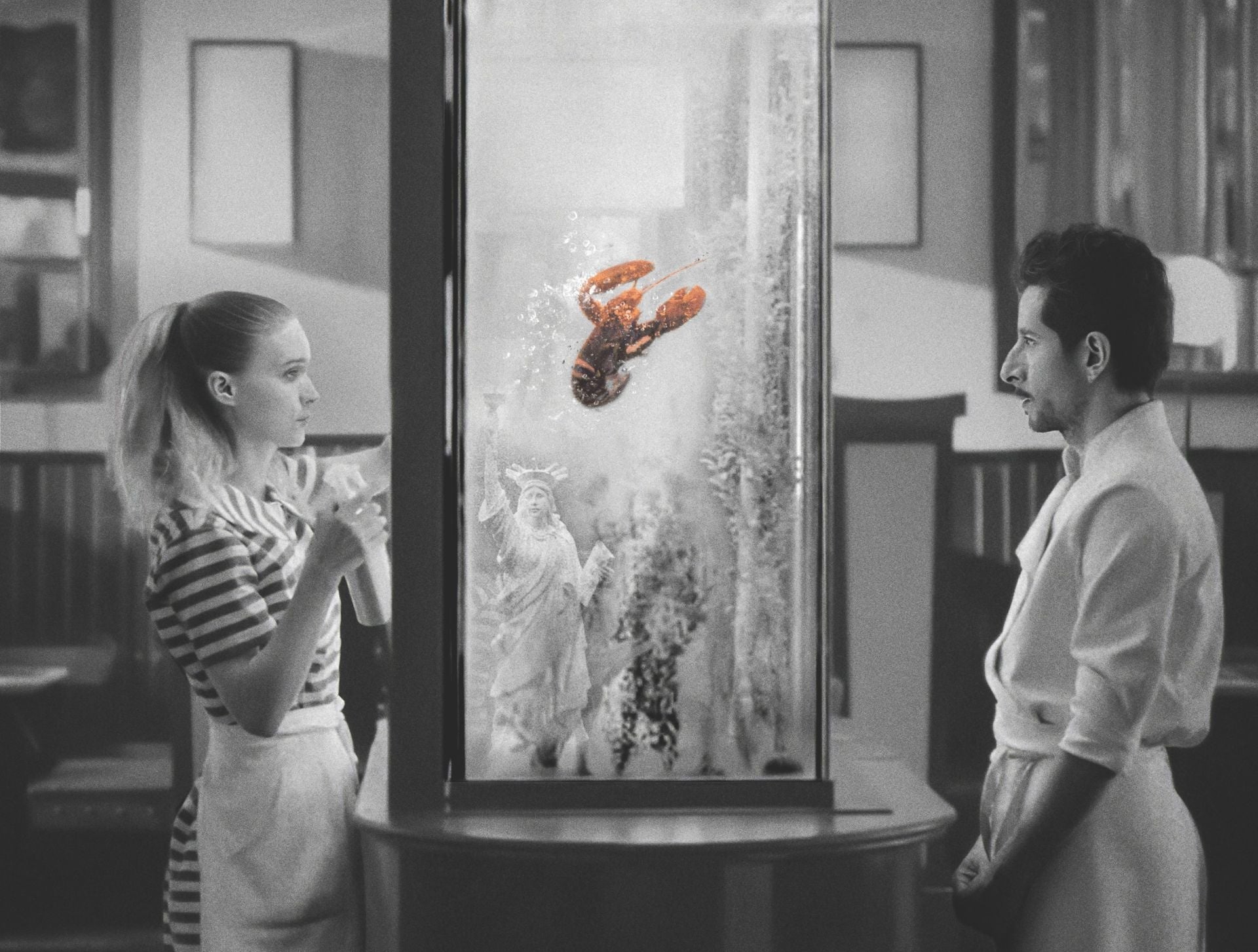 日本版ビジュアルでは、「ザ・グリル」のシンボルである大きな水槽を挟んで見つめ合うふたりの姿が映し出されている。これは、恋人たちの間を隔てる余りに大きなものの象徴でもある。水槽の中には、映画に価値観のメタファーとして登場するロブスターや、アメリカン・ドリームを指す自由の女神像が配されているのもポイントだ。衝撃の厨房エンターテインメントの公開が待ち遠しくなる解禁となった。