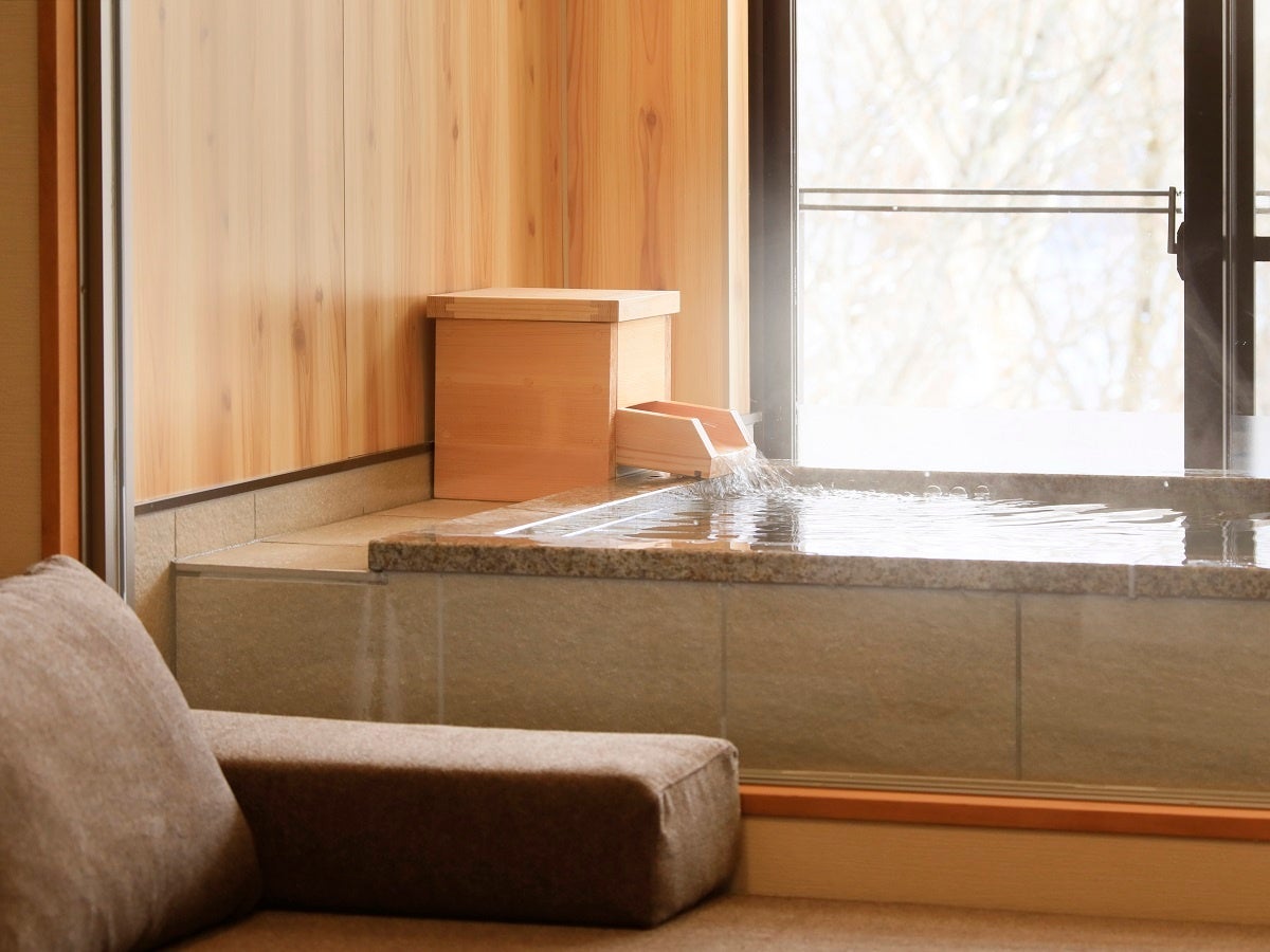 ご宿泊いただく新客室は、自然と調和する心地よいデザインの半露天風呂付き和室で、大きな窓越しに広がる景色を眺めながら、ゆったりと湯浴みを愉しめます。