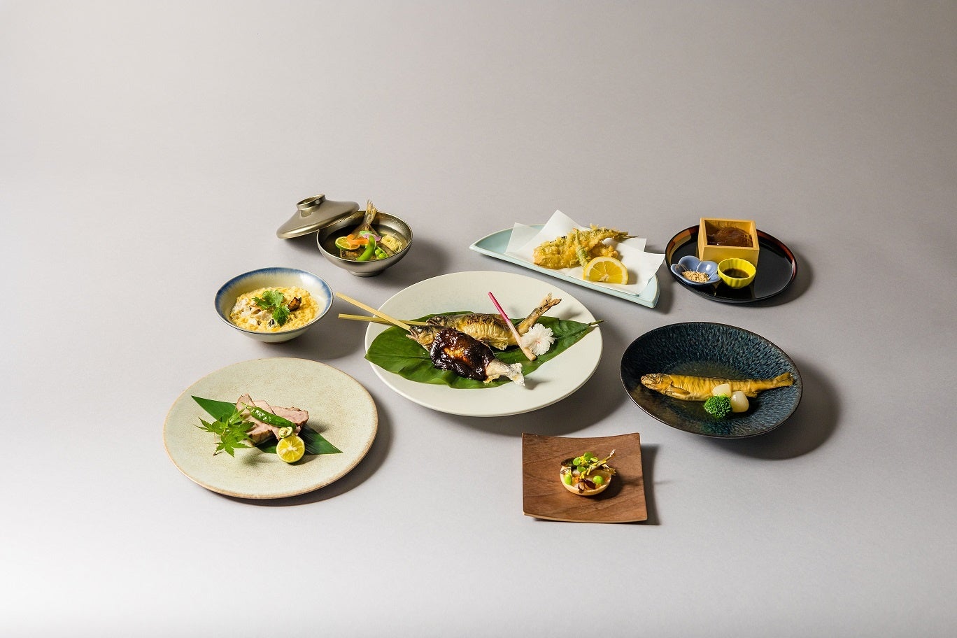 柿酢を使った高山もちのサラダ・稚鮎の甘露煮と枝豆・鮎そうめん・鮎の塩焼き・鮎田楽・鮎と季節野菜の天ぷら・鮎の赤煮・飛騨豚の炭火焼き
