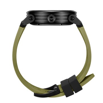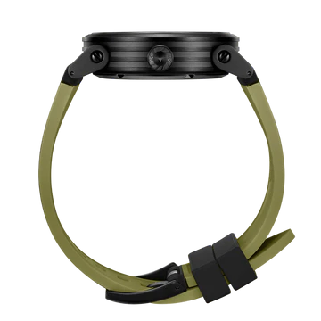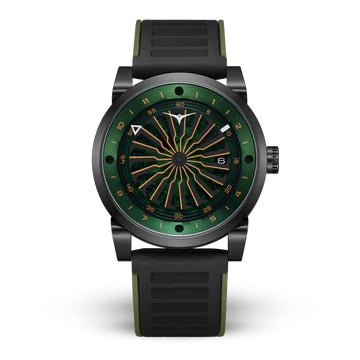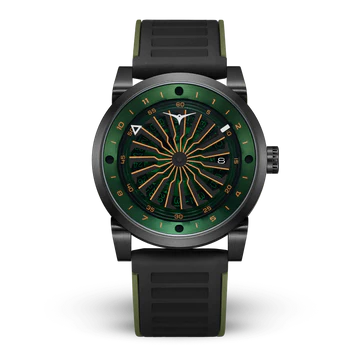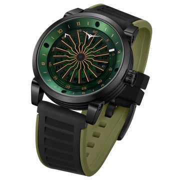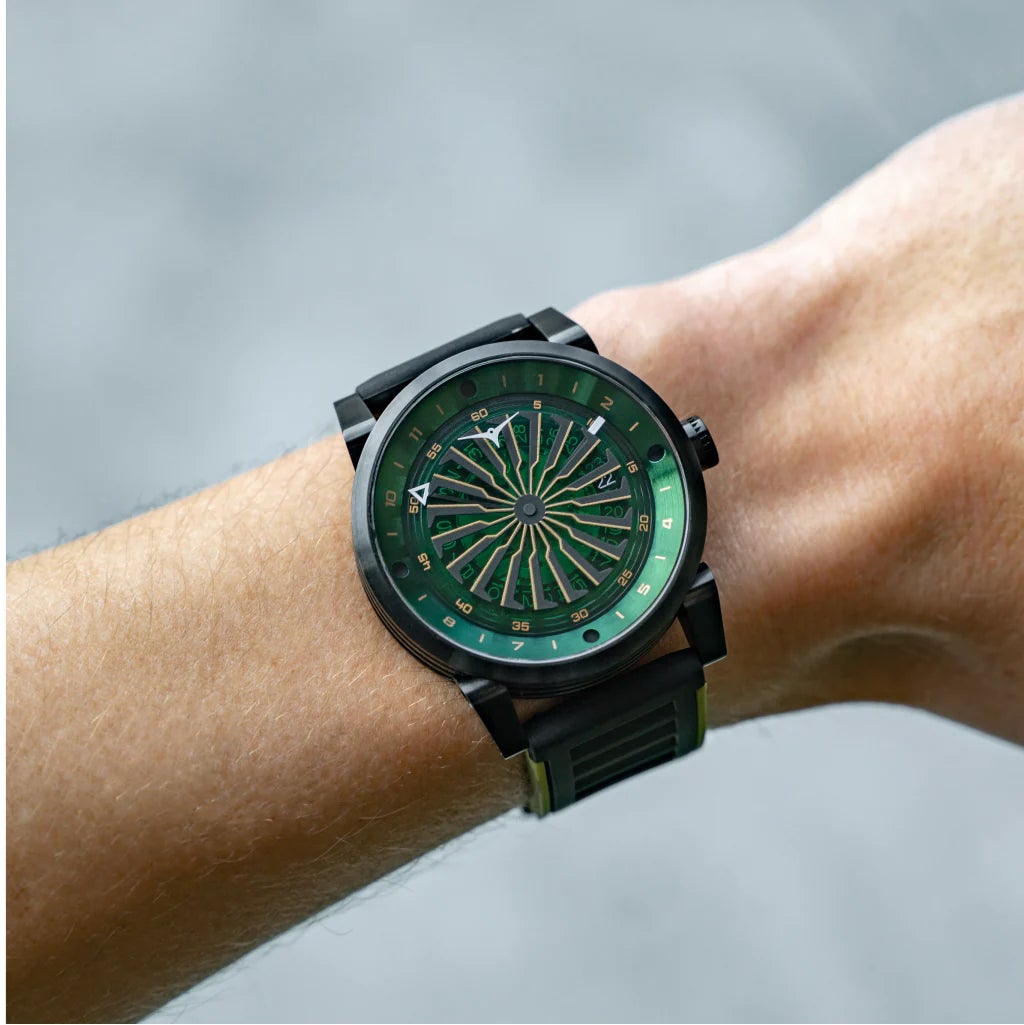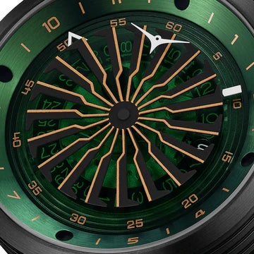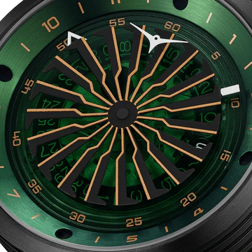 カラーリングはブラックとグリーンの2トーンカラーを採用。ダービン型秒針のエッジにカラーを入れることで、目の錯覚を利用した奥行きの表現を可能にしています。さらに、短針と長針は先端のみ着色する事によって、まるで宙に浮いているかのような錯覚を引き起こします。